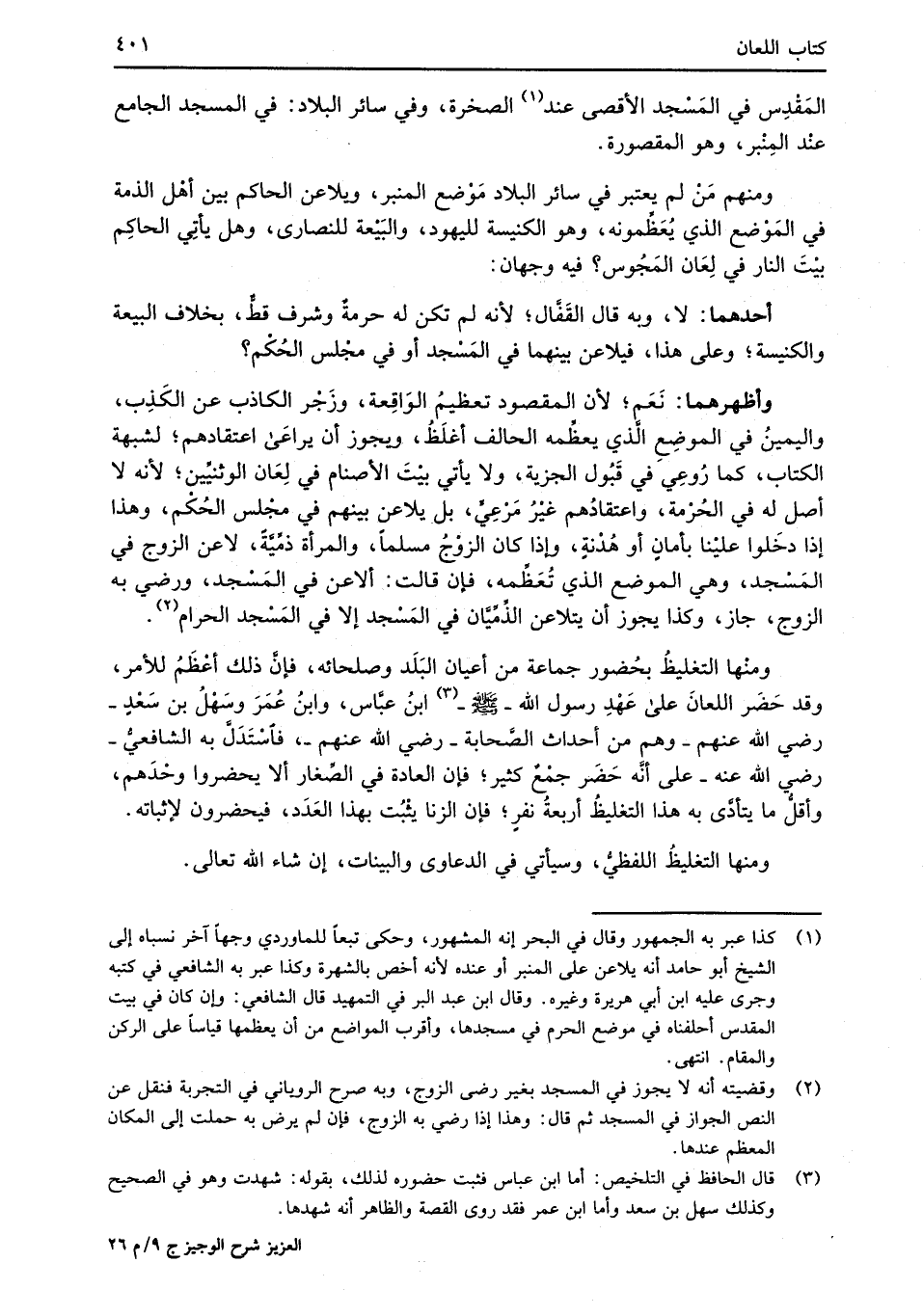 وأظهرهما: نَعَم؛ لأن المقصود تعظيمُ الوَاقِعة، وزَجْر الكاذب عن الكَذِب، واليمينُ في الموضِعِ الَّذي يعظِّمه الحالف أغلَظُ، ويجوز أن يراعَى اعتقادهم؛ لشبهة الكتاب، كما رُوعِي في قَبُول الجزية، ولا يأتي بيْتَ الأصنام في لِعَان الوثنيِّين؛ لأنه لا أصل له في الحُرْمة، واعتقادُهم غيْرُ مَرْعِيٍّ، بل يلاعن بينهم في مجْلس الحُكْم، وهذا إذا دخَلوا عليْنا بأمانٍ أو هُدْنةٍ، وإذا كان الزوْجُ مسلماً، والمرأة ذمِّيَّةً، لاعن الزوج في المَسْجد، وهي الموضع الذي تُعَظِّمه، فإن قالت: ألاعن في المَسْجد، ورضي به الزوج، جاز، وكذا يجوز أن يتلاعن الذِّمِّيَّان في المَسْجد إلا في المَسْجد الحرام (¬2).
