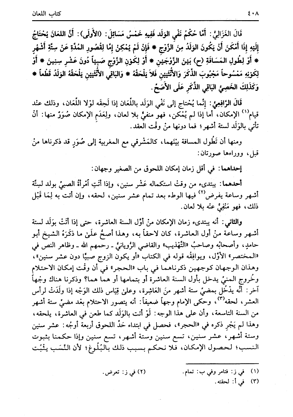 قَالَ الغَزَالِيُّ: أَمَّا حُكْمُ نَفْيِ الوَلَد فَفِيهِ خَمْسُ مَسَائِلَ: (الأَولَى): أَنَّ اللعَانَ يُحْتَاجُ إِلَيْهِ إِذَا أَمْكَنَ أَنْ يَكُونَ الوَلَدُ مِنَ الزَّوْجِ* فَإِنْ لَمْ يُمْكِنْ إِمَّا لِقُصُورِ المُدَّةِ عَنْ سِتَّةِ أَشْهُرٍ* أَوْ لِطُولِ المَسَافَةِ (ح) بَيْنَ الزَّوْجَيْنِ* أَوْ لِكَوْنِ الزَّوْجِ صَبِيّاً دُونَ عَشْرِ سِنِينَ* أَوْ لِكَوْنِهِ مَمْسُوحاً مَجْبُوبَ الذَّكَرَ وَالأُنْثَيَيْنِ فَلاَ يَلْحَقُهُ* وَالبَاقِي الأُنْثَيَيْنِ يَلْحَقُةُ الوَلَدُ قَطْعاً* وَكَذَلِكَ الخَصِيُّ البَاقِي الذَّكَرِ عَلَى الأَصَحِّ.