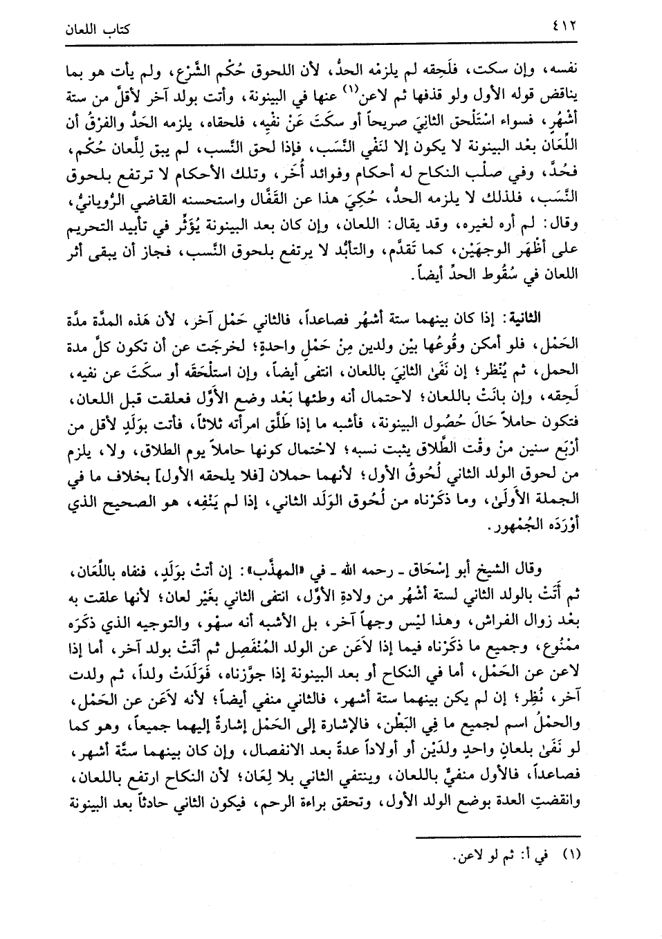 وقال الشيخ أبو إسْحَاق -رحمه الله- في "المهذَّب": إن أتتْ بوَلَدٍ، فنفاه باللِّعَان، ثم أَتَتْ بالولد الثاني لستة أشْهُر من ولادةِ الأوَّل، انتفى الثاني بغَيْر لعان؛ لأنها علقت به بعْد زوال الفراش، وهذا ليْس وجهاً آخر، بل الأشبه أنه سهْو، والتوجيه الذي ذكَرَه ممْنُوع، وجميع ما ذكَرْناه فيما إذا لاَعَن عن الولد المُنْفَصِل ثم أتَتْ بولد آخر، أما إذا لاعن عن الحَمْل، أما في النكاح أو بعد البينونة إذا جوَّزناه، فَوَلَدَتْ ولداً، ثم ولدت آخر، نُظِر؛ إن لم يكن بينهما ستة أشهر، فالثاني منفي أيضاً؛ لأنه لاَعَن عن الحَمْل، والحمْلُ اسم لجميع ما في البَطْن، فالإشارة إلى الحَمْل إشارةٌ إليهما جميعاً، وهو كما لو نَفَى بلعانٍ واحدٍ ولدَيْن أو أولاداً عدةً بعد الانفصال، وإن كان بينهما ستَّة أشهر، فصاعداً، فالأول منفيٌّ باللعان، وينتفي الثاني بلا لِعَان؛ لأن النكاح ارتفع باللعان، وانقضتِ العدة بوضع الولد الأول، وتحقق براءة الرحم، فيكون الثاني حادثاً بعد البينونة