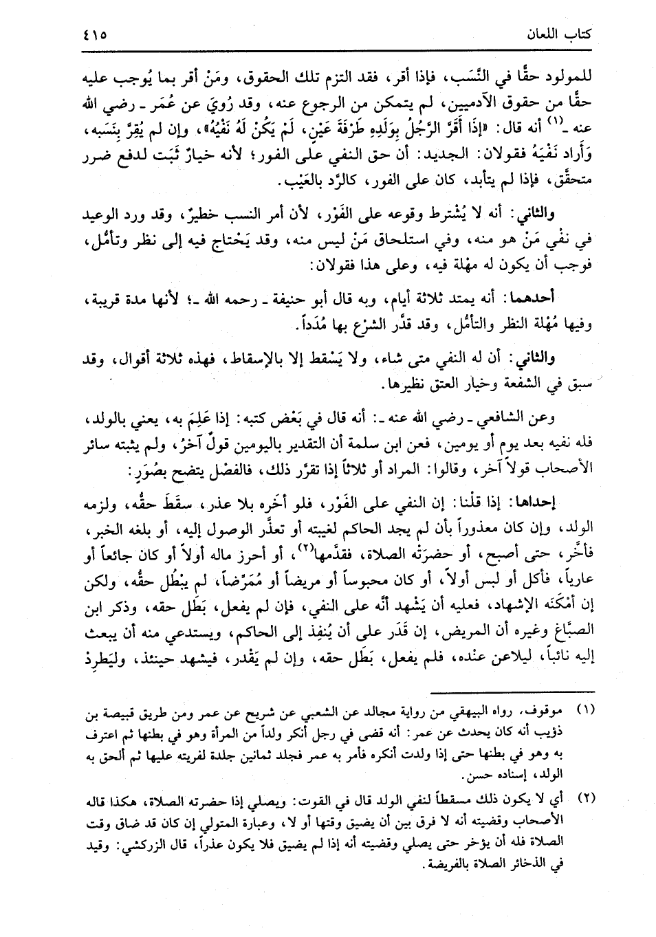 للمولود حقًّا في النَّسَب، فإذا أقر، فقد التزم تلك الحقوق، ومَنْ أقر بما يُوجب عليه حقًّا من حقوق الآدميين، لم يتمكن من الرجوع عنه، وقد رُويَ عن عُمَر -رضي الله عنه- (¬1) أنه قال: "إذَا أَقَرَّ الرَّجُلُ بِوَلَدِهِ طَرْفَةَ عَيْنٍ، لَمْ يَكُنْ لَهُ نَفْيُهُ"، وإن لم يُقِرَّ بِنَسَبه، وَأَراد نَفْيَهُ فقولان: الجديد: أن حق النفي على الفور؛ لأنه خيارٌ ثَبَت لدفع ضرر متحقَّق، فإذا لم يتأبد، كان على الفور، كالرَّد بالعَيْب.