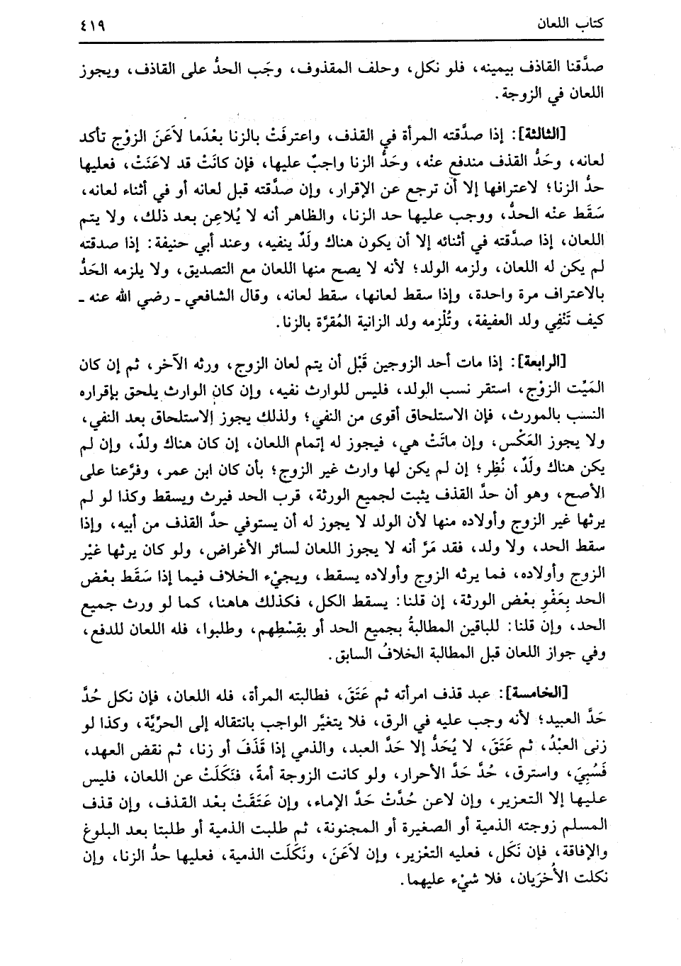 [الخامسة]: عبد قذف امرأته ثم عَتَقَ، فطالبته المرأة، فله اللعان، فان نكل حُدَّ حَدَّ العبيد؛ لأنه وجب عليه في الرق، فلا يتغيَّر الواجب بانتقاله إلى الحرِّيَّة، وكذا لو زنى العبْدُ، ثم عَتَقَ، لا يُحَدُّ إلا حَدَّ العبد، والذمي إذا قَذَفَ أو زنا، ثم نقض العهد، فَسُبِيَ، واسترق، حُدَّ حَدَّ الأحرار، ولو كانت الزوجة أمةً، فنَكَلَتْ عن اللعان، فليس عليها إلا التعزير، وإن لاعن حُدَّتْ حَدَّ الإماء، وإن عَتَقَتْ بعْد القذف، وإن قذف المسلم زوجته الذمية أو الصغيرة أو المجنونة، ثم طلبت الذمية أو طلبتا بعد البلوغ والإفاقة، فإن نَكَل، فعليه التعْزير، وإن لاَعَنَ، ونَكَلَت الذمية، فعليها حدُّ الزنا، وإن نكلت الأُخرَيان، فلا شيْء عليهما.