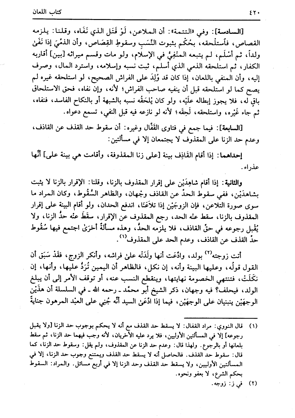 (¬1) قال النووي: مراد القفال: لا يسقط حد القذف مع أنه لا يحكم بوجوب حد الزنا [ولا يقبل رجوعه] إلا في المسألتين الأوليين، فلا يرد عليه الأخريان؛ لأنه وجب فيهما حد الزنا، ثم سقط بلعانها أو بالرجوع. ولهذا قال: وعدم حد الزنا عن المقذوف، ولم يقل: وسقوط حد الزنا، كما قال: سقوط حد القذف. فالحاصل أنه لا يسقط حد القذف ويمتنع وجوب حد الزنا، إلا في المسألتين الأوليين، ولا يسقط حد القذف وحد الزنا إلا في أربع مسائل. والمراد: السقوط بحكم الشرع، لا بعفو ونحوه.