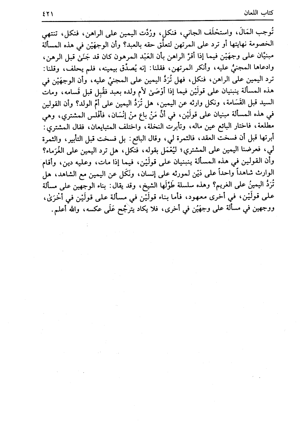 تُوجب المَالَ، واستحْلَف الجاني، فنكل، ورُدَّت اليمين على الراهن، فنكل، تنتهي الخصومة نهايتها أو ترد على المرتهن لتعلُّق حقه بالعبد؟ وأن الوجهَيْن في هذه المسألة مبنيَّان على وجهَيْن فيما إذا أقرَّ الراهن بان العَبْد المرهون كان قد جَنَى قبل الرَّهْن، وادعاها المجنيُّ عليه، وأنكر المرتهن، فقلنا: إنه يُصدَّق بيمينه، فلم يحلف، وقلنا: ترد اليمين على الراهن، فنكل، فهل تُرَدُّ اليمين على المجنيِّ عليه، وأن الوجهَيْن في هذه المسألة ينبنيان على قولَيْن فيما إذا أوْصَى لأم ولده بعبد فقُبِل قبل قَسامه، ومات السيد قبل القَسَامة، ونكل وارثه عن اليمين، هل تُرَدُّ اليمين على أمِّ الولد؟ وأن القولين في هذه المسألة مبنيان على قولَيْن، في أنَّ مَنْ باع منْ إنْسَان، فأفْلس المشتري، وهي مطلعة، فاختار البائع عين ماله، وتأبرت النخلة، واختلف المتبايعان، فقال المشتري: أبرتها قبل أن فسخت العقد، فالثمرة لي، وقال البائع: بل فسخت قبل التأبير، والثمرة لي، فعرضنا اليمين على المشتري؛ ليُعْمَل بقوله، فنكل، هل ترد اليمين على الغُرَماء؟ وأن القولين في هذه المسألة ينبنيان على قولَيْن، فيما إذا مات، وعليه دين، وأقام الوارث شاهداً واحداً على دَيْن لمورثه على إنسان، ونَكَل عن اليمين مع الشاهد، هل تُرَدُّ اليمينُ على الغريم؟ وهذه سلسلة طَوَّلَها الشيخ، وقد يقال: بناء الوجهين على مسألة على قولَيْن، في أخرى معهود، فأما بناء قولَيْن في مسألة على قولَيْن في أخْرَى، ووجهين في مسألة على وجهَيُن في أخرى، فلا يكاد يترجَّح عَلَى عكسه، والله أعلم.