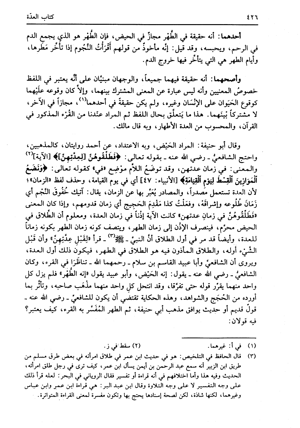 أحدهما: أنه حقيقة في الطُّهْر مجازٌ في الحيض، فإن الطُّهْر هو الذي يجمع الدم في الرحم، ويحبسه، وقد قيل: إنَّه مأخوذٌ من قولهم أَقْرَأْتُ النُّجُوم إذا تأَخَّر مَطَرها، وأيام الطهر هي التي يتأخَّر فيها خروج الدم.