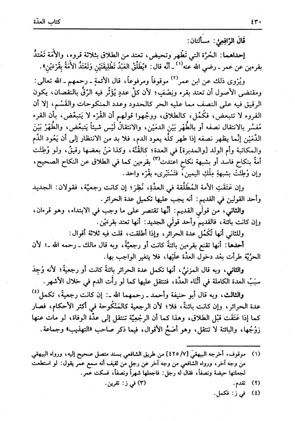 إحداهما: الحُرَّة التي تَطْهر وتحيض، تعتد من الطلاق بثلاثة قروء، والأَمَة تَعْتدُّ بقرءين عن عمر -رضي الله عنه (¬1) - أنَّه قال: "يُطَلِّقُ العَبْدُ تَطْلِيقَتَيْنِ وَتَعْتَدُّ الأمَةُ بِقُرْءَيْنِ".