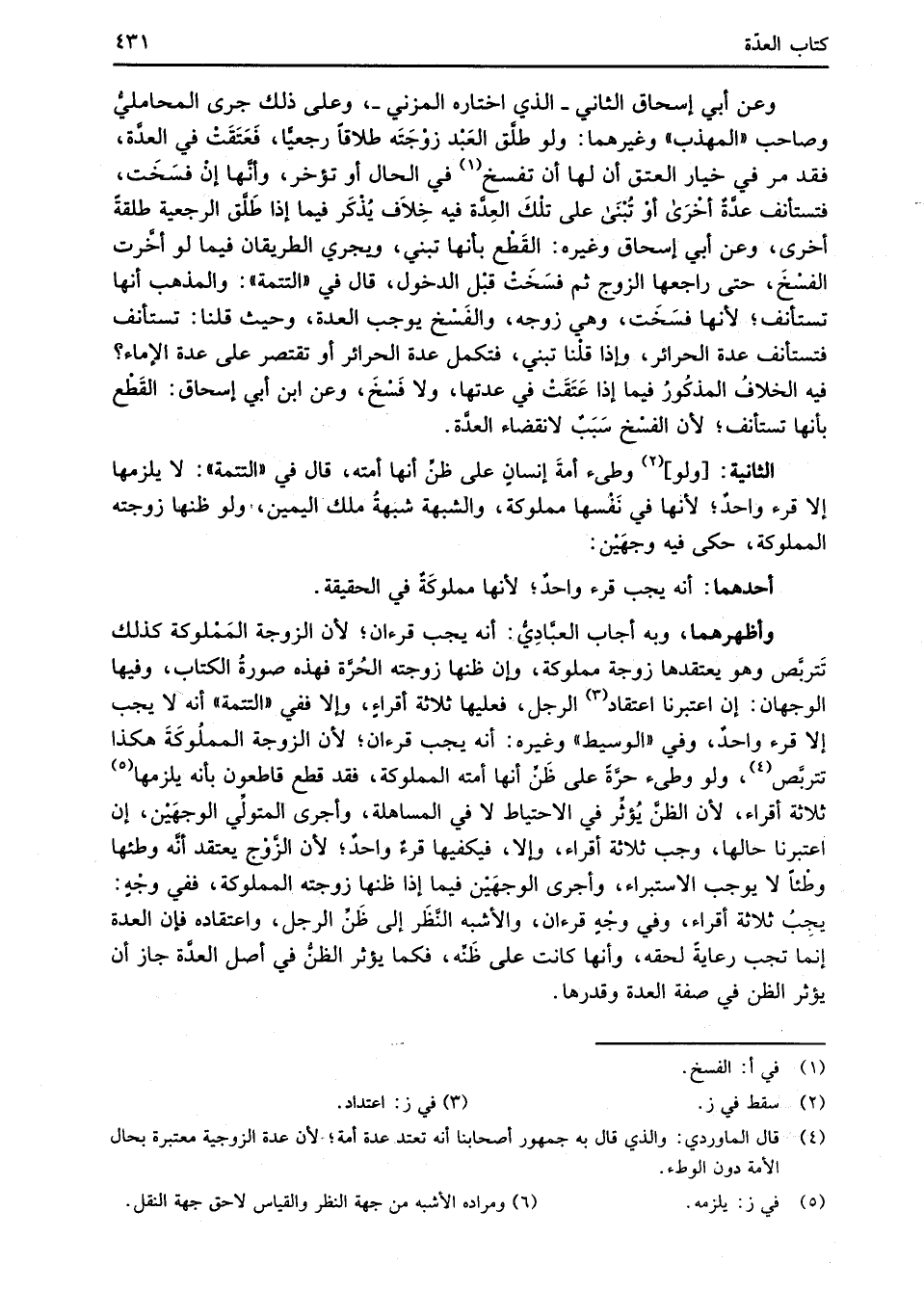 وعن أبي إسحاق الثاني -الذي اختاره المزني-، وعلى ذلك جرى المحامليُّ وصاحب "المهذب" وغيرهما: ولو طلَّق العَبْد زوْجَتَه طلاقاً رجعيًّا، فَعَتَقَتْ في العدَّة، فقد مر في خيار العتق أن لها أن تفسخ (¬1) في الحال أو تؤخر، وأنَّها إنْ فسَخَت، فتستأنف عدَّةٌ أخْرَى أوْ تُبْنَى على تلْكَ العِدَّة فيه خِلاَف يُذْكَر فيما إذا طَلَّق الرجعية طلقةً أخرى، وعن أبي إسحاق وغيره: القَطْع بأنها تبني، ويجري الطريقان فيما لو أخَّرت الفسْخَ، حتى راجعها الزوج ثم فسَخَتْ قبْل الدخول، قال في "التتمة": والمذهب أنها تستأنف؛ لأنها فسَخَت، وهي زوجه، والفَسْخ يوجب العدة، وحيث قلنا: تستأنف فتستأنف عدة الحرائر، وإذا قلْنا تبني، فتكمل عدة الحرائر أو تقتصر على عدة الإماء؟ فيه الخلافُ المذكُورُ فيما إذا عَتَقَتْ في عدتها، ولا فَسْخَ، وعن ابن أبي إسحاق: القَطْع بأنها تستأنف؛ لأن الفسْخ سَبَبٌ لانقضاء العدَّة.