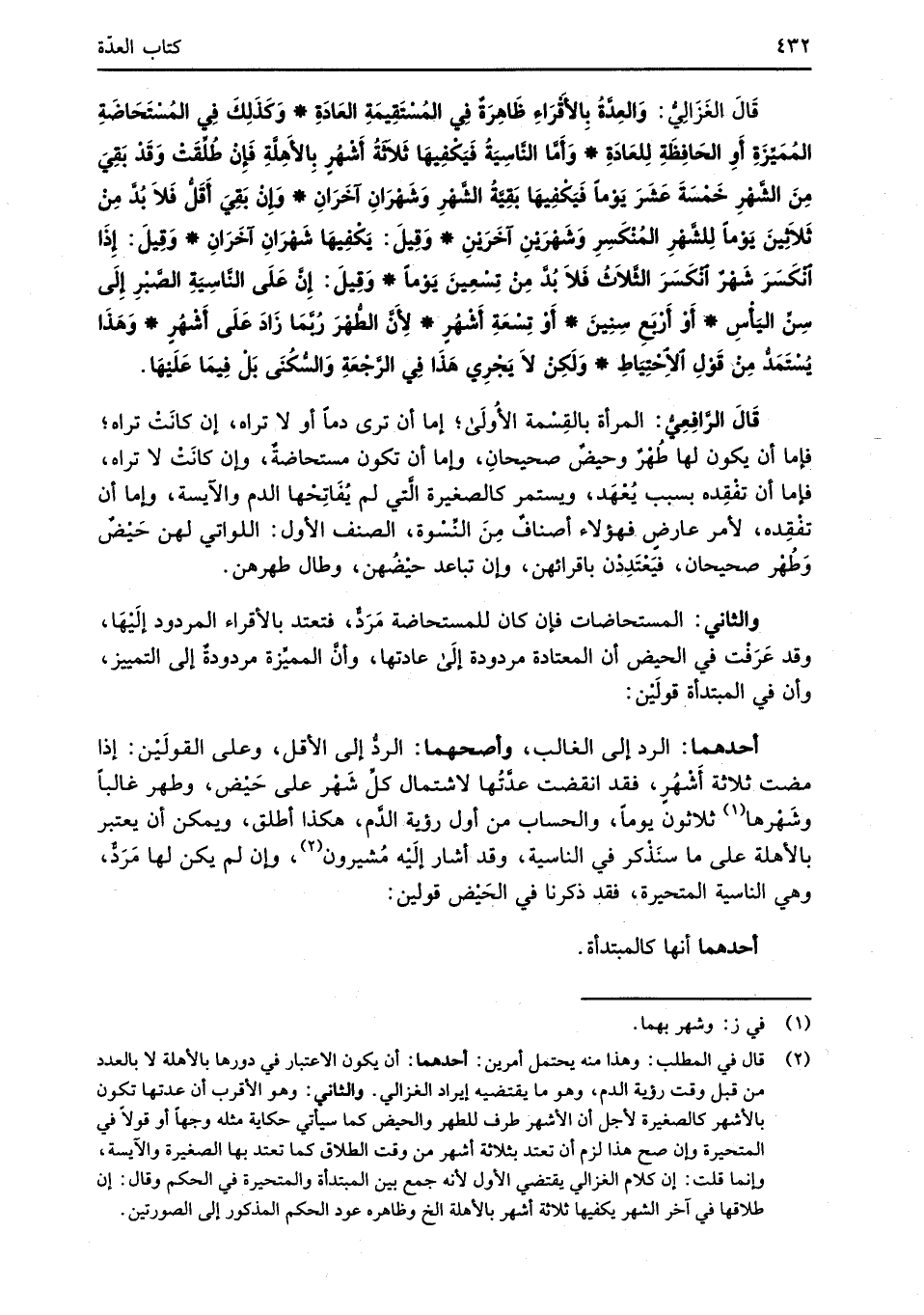 قَالَ الغَزَالِيُّ: وَالعِدَّة بِالأَقْرَاءِ ظَاهِرَةٌ فِي المُسْتَقِيمَةِ العَادَةِ* وَكَذَلِكَ فِي المُسْتَحَاضَةِ المُمَيِّزَةِ أَوِ الحَافِظَةِ لِلعَادَةِ* وَأَمَّا النَّاسِيَةُ فَيَكْفِيهَا ثَلاَثَةُ أَشْهُرٍ بِالأَهَلَّةِ فَإِنْ طُلِّقَتْ وَقَدْ بَقِيَ مِنَ الشَّهْرِ خَمْسَةَ عَشَرَ يَوْماً فَيَكْفِيهَا بَقِيَّةُ الشَّهْرِ وَشَهْرَانِ آخَرَانِ* وَإِنْ بَقِيَ أَقَلُّ فَلاَ بُدَّ مِنْ ثَلاَثِينَ يَوْماً لِلشَّهْرِ المُنْكَسِرِ وَشَهْرَيْنِ آخَرَيْنِ* وَقِيلَ: يَكْفِيهَا شَهْرَانِ آخَرَانِ* وَقِيلَ: إِذَا انْكَسَرَ شَهْرٌ انْكَسَرَ الثَّلاَثُ فَلاَ بُدَّ مِنْ تِسْعِينَ يَوْماً* وَقِيلَ: إِنَّ عَلَى النَّاسِيَةِ الصَّبْرِ إِلَى سِنِّ اليَأْسِ* أَوْ أَرْبَعِ سِنِينَ* أَوْ تِسْعَةِ أَشْهُرٍ* لأَنَّ الطُّهْرَ رُبَّمَا زَادَ عَلَى أَشْهُرٍ* وَهَذَا يُسْتَمَدُّ مِنْ قَوْلِ الاِحْتِيَاطِ* وَلَكِنْ لاَ يَجْرِي هَذَا فِي الرَّجْعَةِ وَالسُّكُنَى بَلْ فِيمَا عَلَيْهَا.
