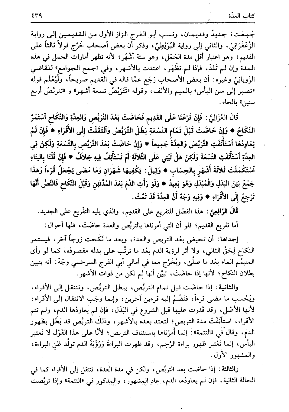 قَالَ الغَزَالِيُّ: فَإِنْ فَرَّعْنَا عَلَى القَدِيمِ فَحَاضَتْ بَعْدَ التَّرَبُّصِ وَالعِدَّةِ وَالنِّكَاحِ اسْتَمَرَّ النِّكَاحُ* وَإنْ حَاضَتْ قَبْلَ تَمَامِ التِّسْعَةِ بَطَلَ التَّرَبُّصْ وانْتَقَلَتْ إِلَى الأَقْرَاءِ* فَإنْ لَمْ يُعَاوِدْهَا اسْتَأْنفَتِ التَّرَبُّصَ وَالعِدَّةَ جَمِيعًا* وَإِنْ حَاضَتْ بَعْدَ التَّرَبُّصِ بِالتِّسْعَةِ وَلَكِنْ فِى العِدَّةِ اسْتَأنفَتِ التِّسْعَةَ وَلَكِنْ هَلْ تَبْنِي عَلَى الثَّلاَثةِ أَمْ تَسْتَأْنِفُ فِيهِ خِلاَفٌ* فَإِنْ قُلْنَا بِالبنَاءِ اسْتَكمَلَتْ ثَلاَثةَ أَشْهُرٍ بِالحِسَابِ* وَقِيلَ: يَكْفِيهَا شَهْرَانِ وَمَا مَضَى يُجْعَلُ قُرْءًا وَهَذَا جَمْعٌ بَيْنَ البَدَلِ وَالمُبْدَلِ وَهُوَ بَعِيدٌ* وَلَوْ رَأَتِ الدَّمَ بَعْدَ المُدَّتَيْنِ وَقَبْلَ النِّكَاحِ فَالنَّصُّ أنَّهَا تَرْجِعُ إِلَى الأَقْرَاءِ* وَفِيهِ وَجْهٌ أَنَّ العِدَّةَ قَدْ تَمَّتْ.