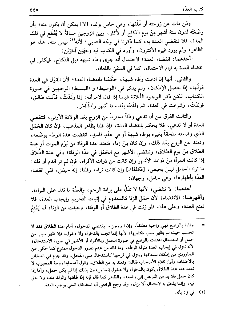 والثالث الفرق بين أن تدعي وطئًا محترمًا من الزوج بعْد الولادة الأولى، فتنقضي العدة أو لا تدعي، فلا يحكم بانقضاء العدة، فإذا قلنا بظاهر المذهب، فإنْ كان الحَمْل الذي وضعته ملحقًا بغيره بوطء شبهة أو في عقدٍ فاسدٍ، انقضت عدة الوطء بوضْعه، وتعتد عن الزوج بعْد ذلك، وإن كان مِنْ زنا، فتعتد عدة الوفاة من يَوْم الموت أو عدة الطلاق مِنْ يوم الطلاق، وتنقضي الأشهر مع الحَمْل في عدَّة الوفاة؛ وفي عدة الطَّلاق إذا كانت المرأة منْ ذوات الأشهر وإن كانت من ذوات الأقراء، فإن لم تر الدم أو قلنا: ما تراه الحامل ليس بحيض، [فكذلك] وإن كانت تراه، وقلنا: إنه حيض، ففي انقضاء العدة بأطهارها، وهي حامل، وجهان: