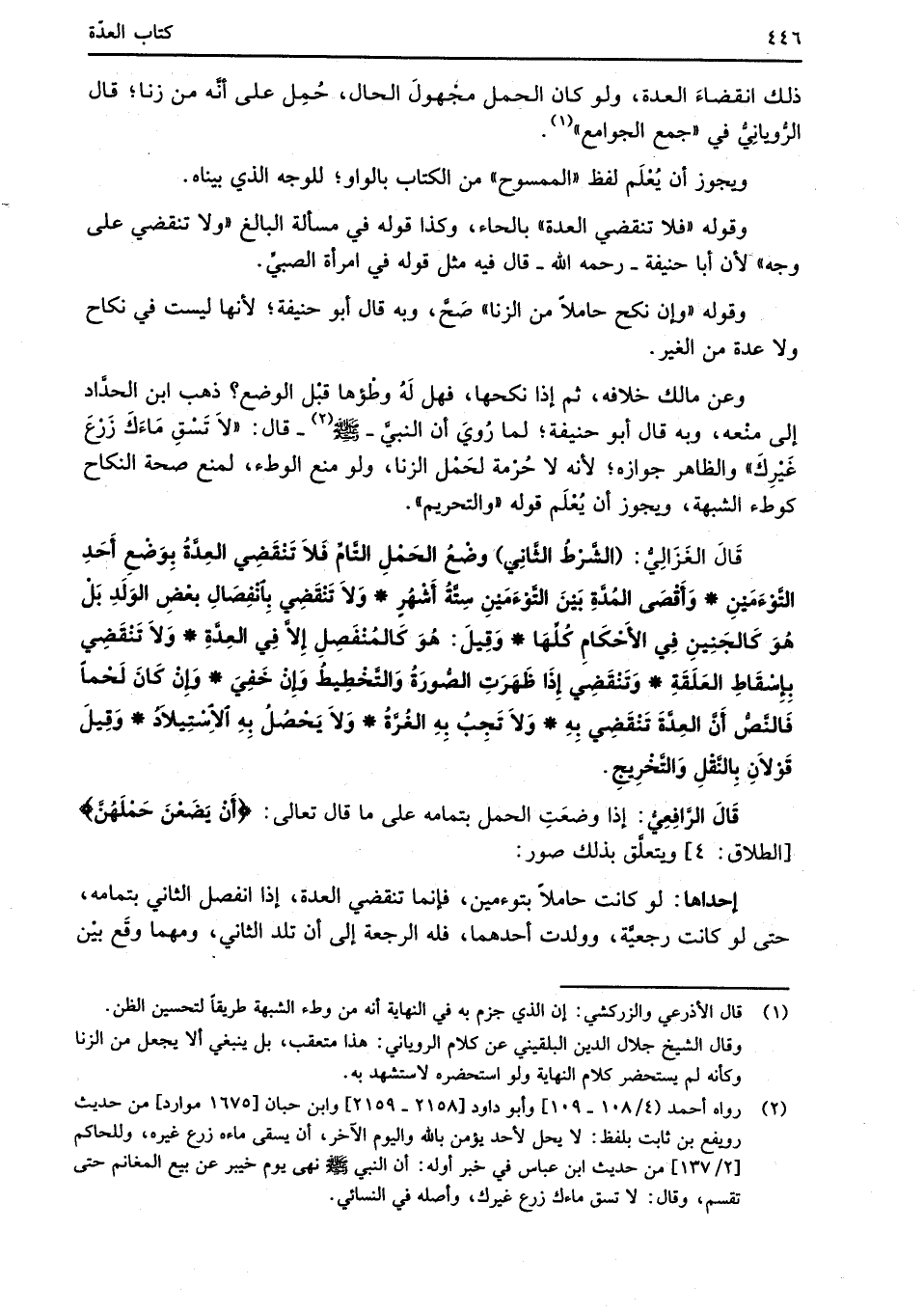 قَالَ الغَزَالِيُّ: (الشَّرطُ الثَّانِي) وضْعُ الحَمْلِ التَّامِّ فَلاَ تَنْقَضِي العِدَّة بِوَضْعِ أَحَدِ التَّوْءَمَيْنِ* وَأَقْصَى المُدَّةِ بَيْنَ التَّوْءَمَيْنِ سِتَّةُ أَشْهُرٍ* وَلاَ تَنْقَضِي بِانْفِصَالِ بعْضِ الوَلَدِ بَلْ هُوَكالجَنِينِ فِي الأَحْكامِ كُلِّهَا* وَقِيلَ: هُوَ كَالمُنْفَصِل إِلاَّ فِي العِدَّةِ* وَلاَ تَنْقَضِي بِإِسْقَاطِ العَلَقَةِ* وَتَنْقَضِي إِذَا ظَهَرَتِ الصُّورَةُ وَالتَّخْطِيطُ وإنْ خَفِيَ* وإنْ كَانَ لَحْمًا فَالنَّصُّ أَنَّ العِدَّةَ تَنْقَضِي بِهِ* وَلاَ تَجِبُ بِهِ الغُرَّةُ* وَلاَ يَحْصُلُ بِهِ الاسْتِيلاَدُ* وَقِيلَ قَوْلاَنِ بِالنَّقْلِ وَالتَّخْرِيجِ.