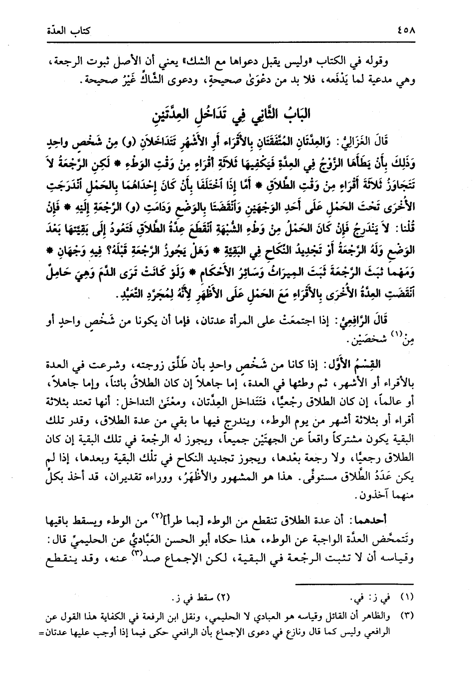 قَالَ الغَزَالِيُّ: وَالعِدَّتَانِ المُتَّفَقَتَانِ بِالأَقْرَاء أَوِ الأَشْهُرِ تَتَدَاخَلاَنِ (و) مِنْ شَخْصٍ واحِدٍ وَذَلِكَ بِأَنْ يَطَأَهَا الزَّوْجُ فِي العِدَّةِ فَيَكْفِيهَا ثَلاثةِ أقْرَاءٍ مِنْ وَقْتِ الوَطْءِ* لَكِنِ الرَّجْعَةُ لاَ تَتَجَاوَزُ ثَلاَثةَ أَقْرَاءٍ مِنْ وَقْتِ الطَّلاَقِ* أَمَّا إِذَا اخْتَلَفَا بِأَنْ كَانَ إِحْدَاهُمَا بِالحَمْلِ انْدَرَجَتِ الأُخْرَى تَحْتَ الحَمْلِ عَلَى أَحَدِ الوَجْهَيْنِ وَانْقَضَتَا بِالوَضْعِ وَدَامَتِ (و) الرَّجْعَةِ إِلَيْهِ* فَإِنْ قُلْنا: لاَ يَنْدَرجُ فَإِنْ كَانَ الحَمْلُ مِنْ وَطْءِ الشُّبْهَةِ انْقَطَعَ عِدَّةُ الطَّلاَقِ فَتَعُودُ إِلَى بَقِيَّتهَا بَعْدَ الوَضْعِ وَلَهُ الرَّجْعَةُ أَوْ تَجْدِيدُ النِّكَاحِ فِي البَقِيَّةِ* وَهَلْ يَجُوزُ الرَّجْعَةِ قَبلَهُ؟ فِيهِ وَجْهَانِ* وَمَهْمَا ثبَثَ الرَّجْعَةَ ثبَتَ المِيرَاثُ وَسَائِرُ الأَحْكَامِ* وَلَوْ كَانَتْ تَرَى الدَّمَ وَهِيَ حَامِلٌ انْقَضَتِ العِدَّةُ الأُخْرَى بِالأَقْرَاءِ مَعَ الحَمْلِ عَلَى الأَظْهَرِ لِأَنَّهُ لِمُجَرَّدِ التَّعَبُّدِ.