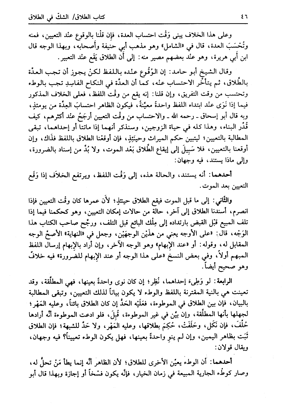 وقال الشيخ أبو حامد: إن الوُقُوع عنْده باللفظ لكنْ يجوز أن تجب العدَّة بالطَّلاق، ثم يتأخر الاحتساب عنْه، كما أن العدَّة في النكاح الفاسِدِ تجب بالوطء وتحتسب من وقت التفريق، وإن قلنا: إنه يقع من وقْت اللفظ، فعلى الخلاف المذكور فيما إذا نَوَى عنْد ابتداء اللفظ واحدةً معيَّنةً، فيكون الظاهر احتسابَ العِدَّة من يومئذٍ، وبه قال أبو إسحاق -رحمه الله- والاحتساب من وقْت التعيين أرجَحُ عنْد أكثرهم، كيف قُدِّر البناء، وهذا كله في حياة الزوجين، وسنذكر أنهما إذا ماتتا أو إحداهما، تبقى المطالبة بالتعيين؛ ليتبين حكم الميراث وحينَئِذٍ، فإن أوقعْنا الطلاق باللفظ فذَاك، وإن أوقعنا بالتعيين، فلا سَبِيلَ إلى إيقاع الطَّلاق بَعْد الموت، ولا بُدَّ من إسناد بالضرورة، وإلى ماذا يستند، فيه وجهان: