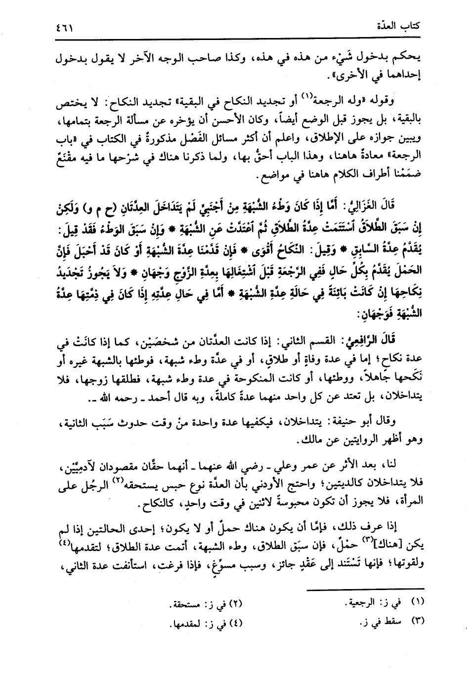قَالَ الغَزَالِيُّ: أَمَّا إِذَا كَانَ وَطْءُ الشُّبْهَةِ مِنْ أَجْنَبِيٍّ لَمْ يتَدَاخَلَ العِدَّتَانِ (ح م و) وَلَكِنْ إِنْ سَبَقَ الطَّلاَقُ اسْتَتَمَتْ عِدَّةُ الطَّلاَقِ ثُمَّ اعْتَدَّتْ عَنِ الشُّبْهَةِ* وَإِنْ سَبَقَ الوَطْءُ فَقَدْ قِيلَ: يُقَدَّمُ عِدَّةُ السَّابِقِ* وَقِيلَ: النِّكَاحُ أَقْوَى* فَإِنْ قَدَّمْنَا عِدَّةَ الشُّبْهَةِ أَوْ كَانَ قَدْ أَحْبَلَ فَإِنَّ الحَمْلَ يُقَدَّمُ بِكُلِّ حَالٍ فَفِي الرَّجْعَةِ قَبْلَ اشْتِغَالِهَا بِعِدَّةِ الزَّوْجِ وَجْهَانِ* وَلاَ يَجُوزُ تَجْدَيدُ نِكَاحِهَا إِنْ كَانَتْ بَائِنَةً فِي حَالَةِ عِدَّةِ الشُّبْهَةِ* أَمَّا فِي حَالِ عِدَّتِهِ إِذَا كَانَ فِي ذِمَّتِهَا عِدَّةُ الشُّبْهَةِ فَوَجْهَانِ: