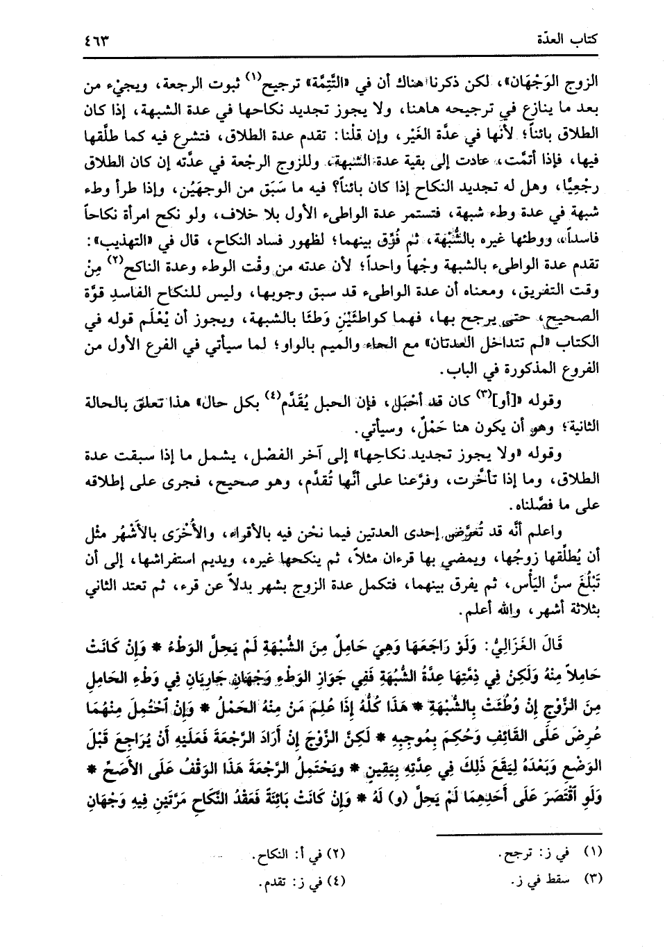 قَالَ الغَزَالِيُّ: وَلَوْ رَاجَعَهَا وَهِيَ حَامِلٌ مِنَ الشُّبْهَةِ لَمْ يَحِلَّ الوَطْءُ* وَإِنْ كَانَتْ حَامِلاً مِنْهُ وَلَكِنْ فِي ذِمَّتِهَا عِدَّةُ الشُّبهَةِ فَفِي جَوَازِ الوَطْءِ وَجْهَانِ جَارِيَانِ فِي وَطْءِ الحَامِلِ مِنَ الزَّوْجِ إنْ وُطُئَتْ بِالشُّبْهَةِ* هَذَا كُلُّهُ إِذَا عُلِم مَن مِنْهُ الحَمْلُ* وَإِنْ احْتُمِلَ مِنْهُمَا عُرِضَ عَلَى القَائِفِ وَحُكِمَ بِمُوجِبِهِ* لَكِنَّ الزَّوْجَ إنْ أَرَادَ الرَّجْعَةَ فَعَلَيْهِ أَنْ يُرَاجِعَ قَبْلَ الوَضْعِ وَبَعْدَهُ لِيَقَعَ ذَلِكَ فِي عِدَّتِهِ بِيَقِين* ويَحْتَمِلُ الرَّجْعَةَ هَذَا الوَقْفُ عَلَى الأصَحِّ* وَلَوِ اقْتَصَرَ عَلَى أَحَدِهِمَا لَمْ يَحِلَّ (و) لَهُ* وَإِن كَانَتْ بَائِنَةً فَعَقْدُ النِّكَاحِ مَرَّتَيْنِ فِيهِ وَجْهَانِ