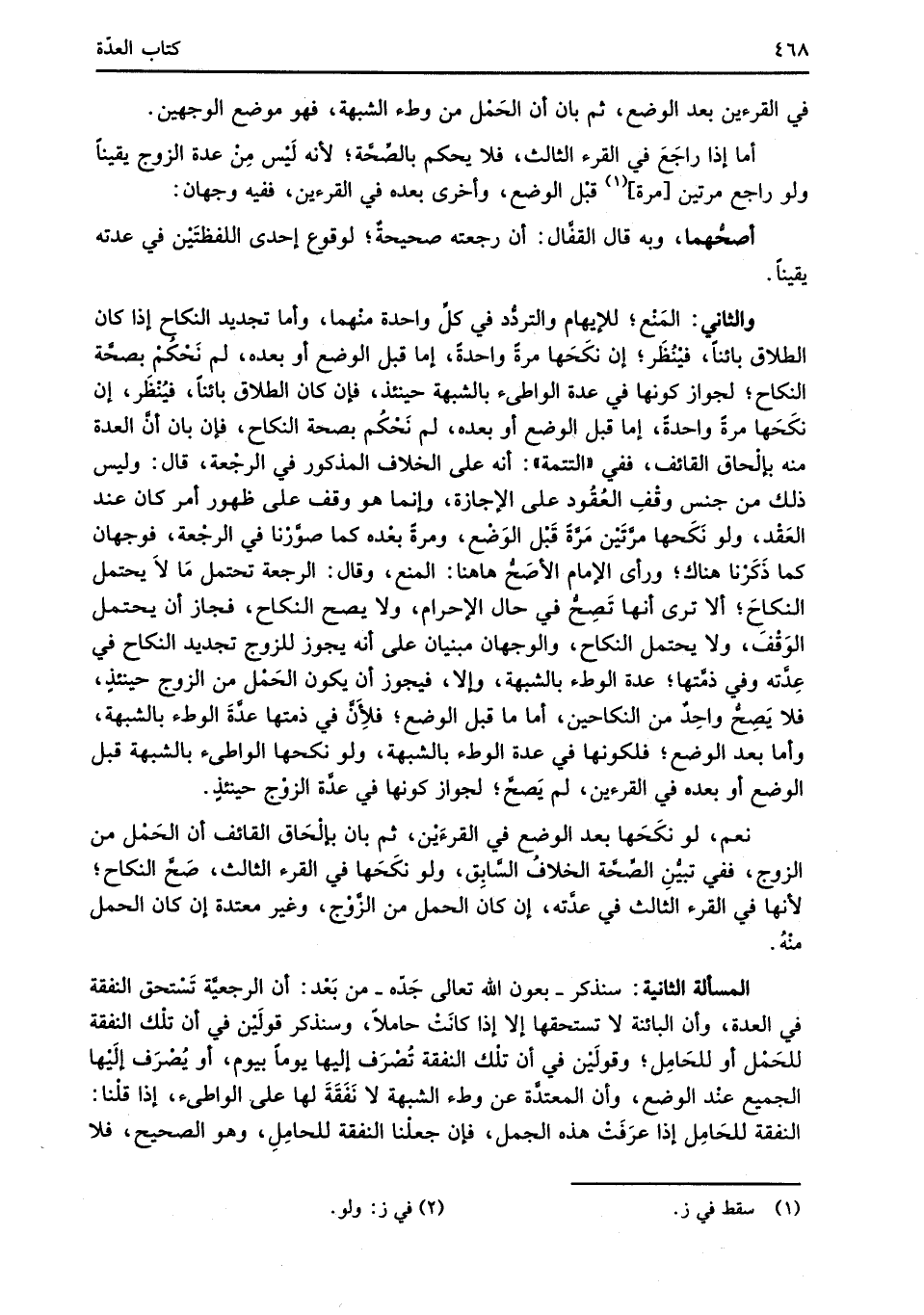 المسألة الثانية: سنذكر -بعون الله تعالى جَدّه- من بَعْد: أن الرجعيَّة تَسْتحق النفقة في العدة، وأن البائنة لا تستحقها إلا إذا كانَتْ حاملاً، وسنذكر قولَيْن في أن تلْك النفقة للحَمْل أو للحَامِل؛ وقولَيْن في أن تلْك النفقة تُصْرَف إليها يومًا بيوم، أو يُصْرَف إلَيْها الجميع عنْد الوضع، وأن المعتدَّة عن وطء الشبهة لا نَفَقَةَ لها على الواطئ، إذا قلْنا: النفقة للحَامِل إذا عرَفَتْ هذه الجمل، فإن جعلْنا النفقة للحامِلِ، وهو الصحيح، فلا