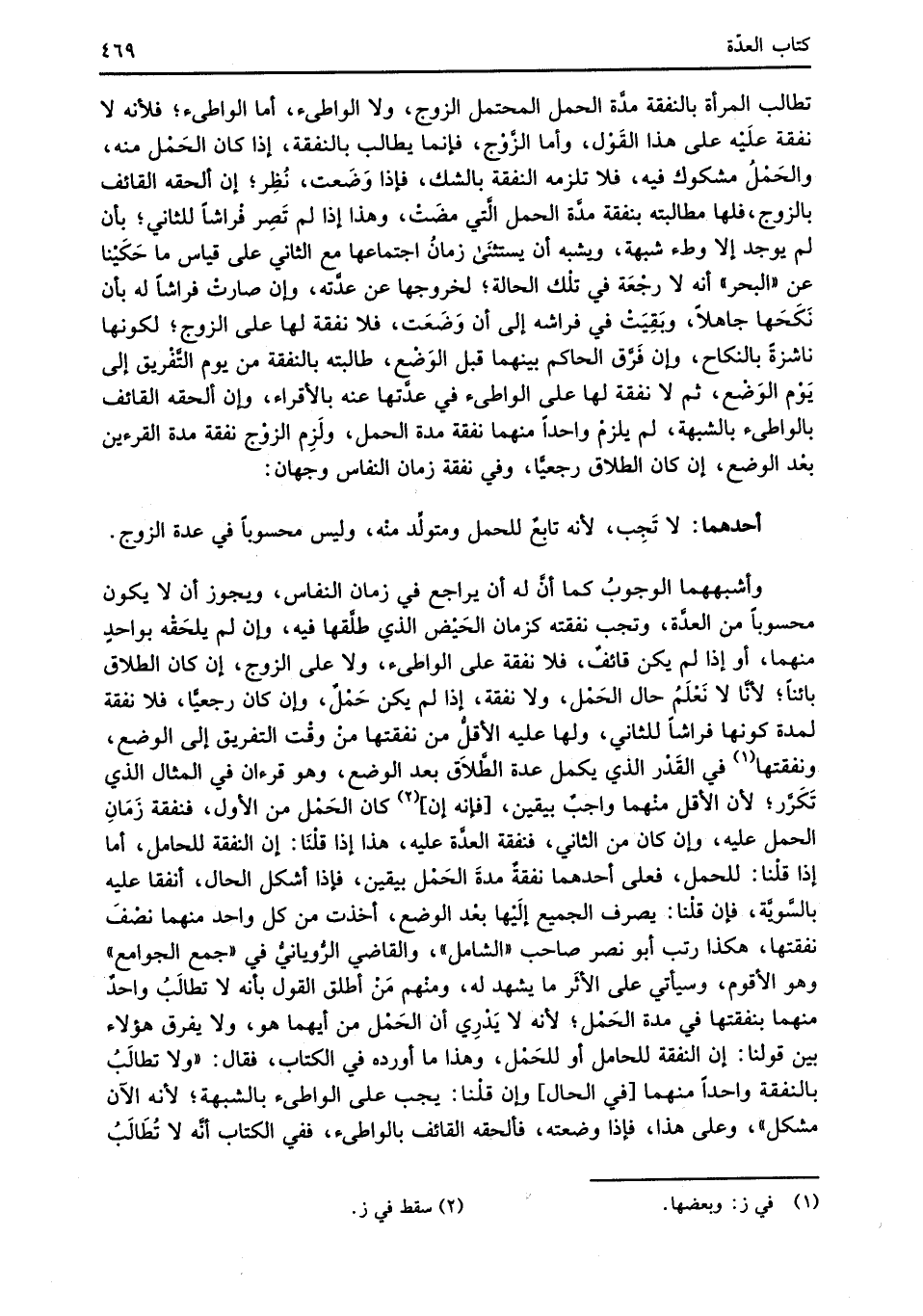 وأشبههما الوجوبُ كما أنَّ له أن يراجع في زمان النفاس، ويجوز أن لا يكون محسوبًا من العدَّة، وتجب نفقته كزمان الحَيْض الذي طلَّقها فيه، وإن لم يلحَقْه بواحدٍ منهما، أو إذا لم يكن قائفٌ، فلا نفقة على الواطئ، ولا على الزوج، إن كان الطلاق بائنًا؛ لأنَّا لا نَعْلَمُ حال الحَمْل، ولا نفقة، إذا لم يكن حَمْلٌ، وإن كان رجعيًّا، فلا نفقة لمدة كونها فراشًا للثاني، ولها عليه الأقلُّ من نفقتها منْ وقْت التفريق إلى الوضع، ونفقتها (¬1) في القَدْر الذي يكمل عدة الطَّلاَق بعد الوضع، وهو قرءان في المثال الذي تَكَرَّر؛ لأن الأقل منْهما واجبٌ بيقين، [فإنه إن] (¬2) كان الحَمْل من الأول، فنفقة زَمَانِ الحمل عليه، وإن كان من الثاني، فنفقة العدَّة عليه، هذا إذا قلْنَا: إن النفقة للحامل، أما إذا قلْنا: للحمل، فعلى أحدهما نفقةٌ مدةَ الحَمْل بيقين، فإذا أشكل الحال، أنفقا عليه بالسَّويَّة، فإن قلْنا: يصرف الجميع إلَيْها بعْد الوضع، أخذت من كل واحد منهما نصْفَ نفقتها، هكذا رتب أبو نصر صاحب "الشامل"، والقاضي الرُّويانيُّ في "جمع الجوامع" وهو الأقوم، وسيأتي على الأثَر ما يشهد له، ومنْهم مَنْ أطلق القول بأنه لا تطالَبُ واحدٌ منهما بنفقتها في مدة الحَمْل؛ لأنه لا يَدْرِي أن الحَمْل من أيهما هو، ولا يفرق هؤلاء بين قولنا: إن النفقة للحامل أو للحَمْل، وهذا ما أورده في الكتاب، فقال: "ولا تطالَبُ بالنفقة واحدًا منهما [في الحال] وإن قلْنا: يجب على الواطئ بالشبهة؛ لأنه الآن مشكل"، وعلى هذا، فإذا وضعته، فألحقه القائف بالواطئ، ففي الكتاب أنَّه لا تُطَالَبُ