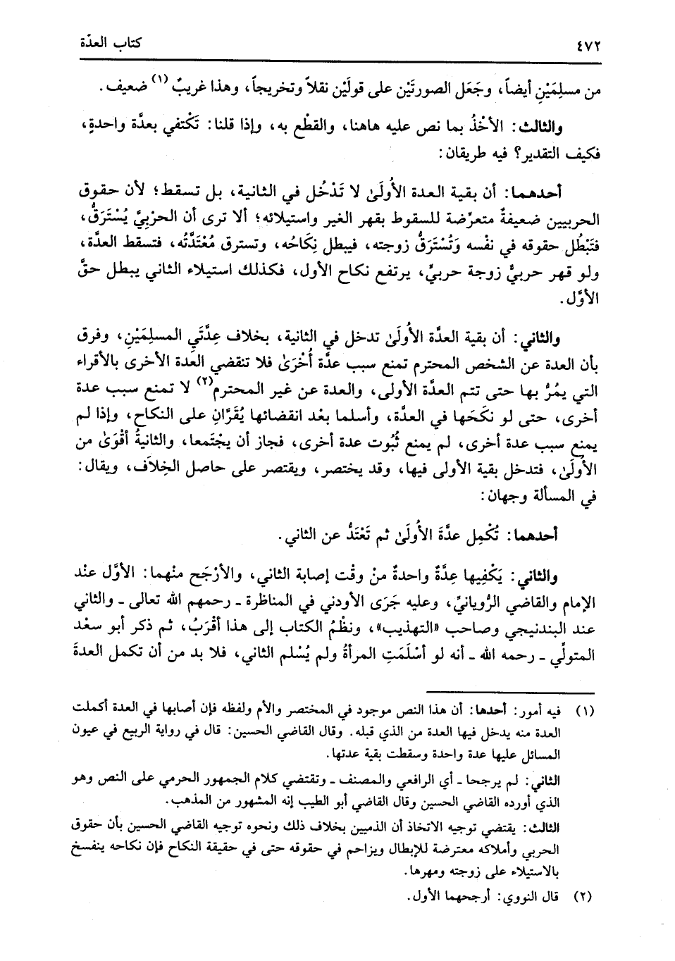 والثاني: يَكْفِيها عِدَّةٌ واحدةٌ منْ وقْت إصابة الثاني، والأرْجَح منْهما: الأوَّل عنْد الإِمام والقاضي الرُّويانيُّ، وعليه جَرَى الأودني في المناظرة -رحمهم الله تعالى- والثاني عند البندنيجي وصاحب "التهذيب"، ونظْمُ الكتاب إلى هذا أقْرَبُ، ثم ذكر أبو سعْد المتولِّي -رحمه الله- أنه لو أسْلَمَتِ المرأةُ ولم يُسْلم الثاني، فلا بد من أن تكمل العدةَ