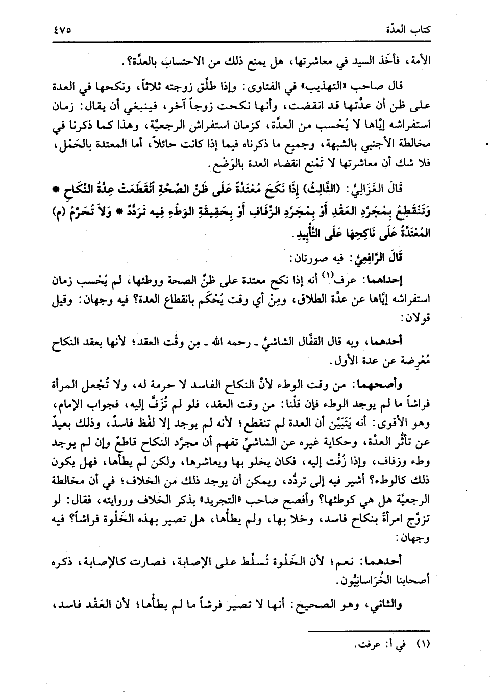 وأصحهما: من وقت الوطء لأنَّ النكاح الفاسد لا حرمة له، ولا تُجْعل المرأة فراشًا ما لم يوجد الوطء فإن قلْنا: من وقت العقد، فلو لم تُزَفُّ إليه، فجواب الإِمام، وهو الأقوى: أنه يَتَبَيَّن أن العدة لم تنقطع؛ لأنه لم يوجد إلا لفْظ فاسدٌ، وذلك بعيد عن تأثُّر العدَّة، وحكاية غيره عن الشاشيِّ تفهم أن مجرَّد النكاح قاطعٌ وإن لم يوجد وطء وزفاف، وإذا زُفَّت إليه، فكان يخلو بها ويعاشرها ولكن لم يطأها، فهل يكون ذلك كالوطء؟ أشير فيه إلى تردُّد، ويمكن أن يوجد ذلك من الخلاف؛ في أن مخالطة الرجعيَّة هل هي كوطئها؟ وأفصح صاحب "التجريد" بذكر الخلاف وروايته، فقال: لو تزوَّج امرأةً بنكاح فاسد، وخلا بها ولم يطأْها، هل تصير بهذه الخَلْوة فراشًا؟ فيه وجهان: