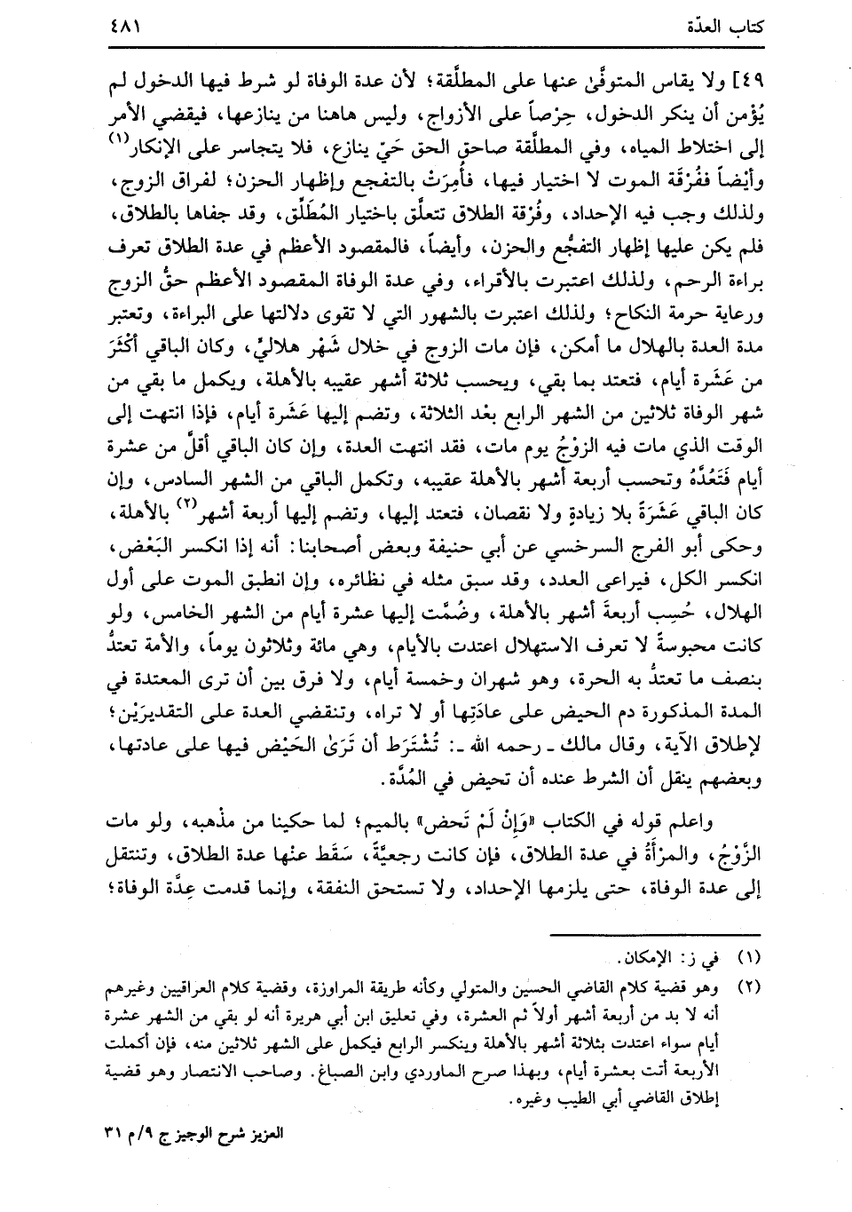 49] ولا يقاس المتوفَّى عنها على المطلَّقة؛ لأن عدَّة الوفاة لو شرط فيها الدخول لم يُؤْمن أن ينكر الدخول، حِرْصاً على الأزواج، وليس هاهنا من ينازعها، فيقضي الأمر إلى اختلاط المياه، وفي المطلَّقة صاحق الحق حَيّ ينازع، فلا يتجاسر على الإنكار (¬1) وأيْضاً ففُرْقَة الموت لا اختيار فيها، فأُمِرَتْ بالتفجع وإظهار الحزن؛ لفراق الزوج، ولذلك وجب فيه الإحداد، وفُرْقة الطلاق تتعلَّق باختيار المُطَلِّق، وقد جفاها بالطلاق، فلم يكن عليها إظهار التفجُّع والحزن، وأيضاً، فالمقصود الأعظم في عدة الطلاق تعرف براءة الرحم، ولذلك اعتبرت بالأقراء، وفي عدة الوفاة المقصود الأعظم حقُّ الزوج ورعاية حرمة النكاح؛ ولذلك اعتبرت بالشهور التي لا تقوى دلالتها على البراءة، وتعتبر مدة العدة بالهلال ما أمكن، فإن مات الزوج في خلال شَهْر هلاليِّ، وكان الباقي أكْثَرَ من عَشَرة أيام، فتعتد بما بقي، ويحسب ثلاثة أشهر عقيبه بالأهلة، ويكمل ما بقي من شهر الوفاة ثلاثين من الشهر الرابع بعْد الثلاثة، وتضم إليها عَشَرة أيام، فإذا انتهت إلى الوقت الذي مات فيه الزوْجُ يوم مات، فقدإنتهت العدة، وإن كان الباقي أقلَّ من عشرة أيام فَتَعُدَّهُ وتحسب أربعة أشهر بالأهلة عقيبه، وتكمل الباقي من الشهر السادس، وإن كان الباقي عَشَرَةً بلا زيادةٍ ولا نقصان، فتعتد إليها، وتضم إليها أربعة أشهر (¬2) بالأهلة، وحكى أبو الفرج السرخسي عن أبي حنيفة وبعض أصحابنا: أنه إذا انكسر البَعْض، انكسر الكل، فيراعى العدد، وقد سبق مثله في نظائره، وإن انطبق الموت على أول الهلال، حُسِب أربعةَ أشهر بالأهلة، وضُمَّت إليها عشرة أيام من الشهر الخامس، ولو كانت محبوسةً لا تعرف الاستهلال اعتدت بالأيام، وهي مائة وثلاثون يوماً، والأمة تعتدُّ بنصف ما تعتدُّ به الحرة، وهو شهران وخمسة أيام، ولا فرق بين أن ترى المعتدة في المدة المذكورة دم الحيض على عادَتِها أو لا تراه، وتنقضي العدة على التقديرَيْن؛ لإطلاق الآية، وقال مالك -رحمه الله-: تُشْتَرَط أن تَرَى الحَيْض فيها على عادتها، وبعضهم ينقل أن الشرط عنده أن تحيض في المُدَّة.
