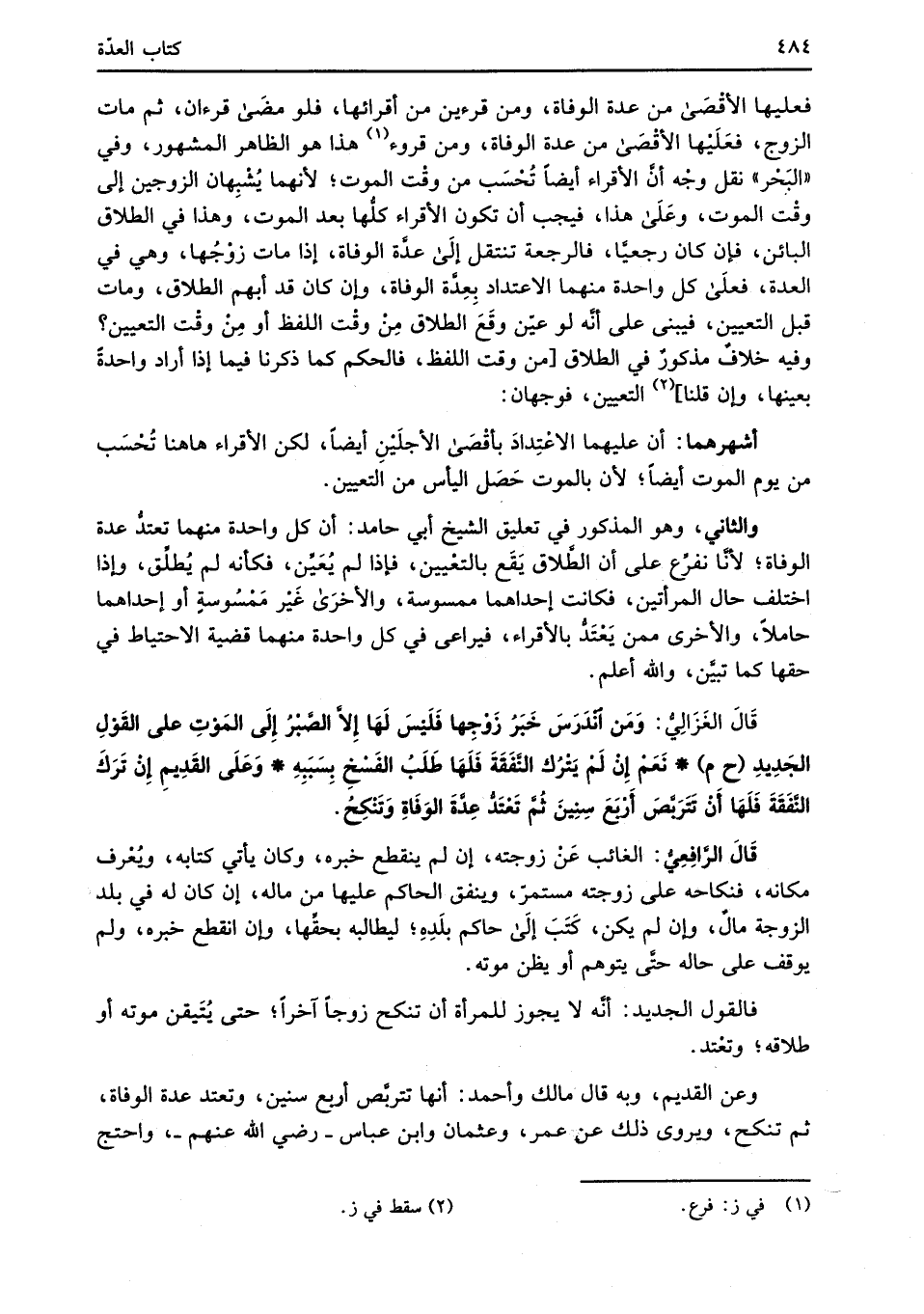 فعليها الأقْصَى من عدة الوفاة، ومن قرءين من أقرائها، فلو مضَى قرءان، ثم مات الزوج، فعَلَيْها الأقْصَى من عدة الوفاة، ومن قروء (¬1) هذا هو الظاهر المشهور، وفي "البَحْر" نقل وجْه أنَّ الأقراء أيضاً تُحْسَب من وقْت الموت؛ لأنهما يُشْبِهان الزوجين إلى وقْت الموت، وعَلَى هذا، فيجب أن تكون الأقراء كلُّها بعد الموت، وهذا في الطلاق البائن، فان كان رجعيّاً، فالرجعة تنتقل إلَى عدَّة الوفاة، إذا مات زوْجُها، وهي في العدَّة، فعلَى كل واحدة منهما الاعتداد بِعِدَّة الوفاة، وإن كان قد أبهم الطلاق، ومات قبْل التعيين، فيبنى على أنَّه لو عيّن وقَعَ الطلاق مِنْ وقْت اللفظ أو مِنْ وقْت التعيين؟ وفيه خلافٌ مذكورٌ في الطلاق [من وقت اللفظ، فالحكم كما ذكرنا فيما إذا أراد واحدةً بعينها، وإن قلنا] (¬2) التعيين، فوجهان: