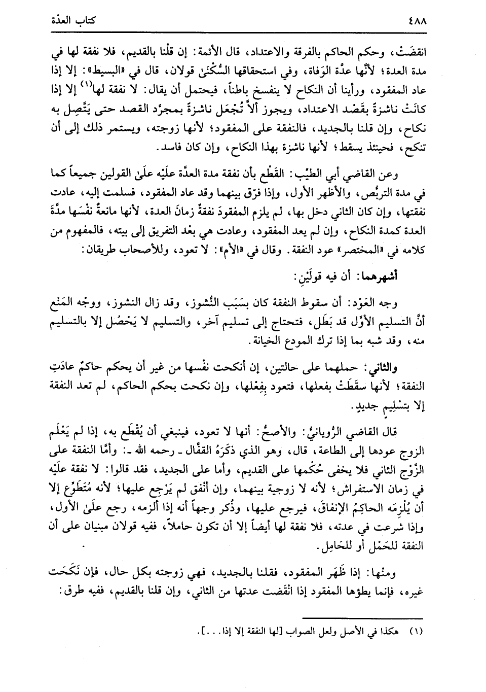 وعن القاضي أبي الطيِّب: القَطْع بان نفقة مدة العدَّة علَيْه عَلَى القولين جميعاً كما في مدة التربُّص، والأظهر الأول، وإذا فرّق بينهما وقد عاد المفقود، فسلمت إليه، عادت نفقتها، وإن كان الثاني دخل بها، لم يلزم المفقودَ نفقةٌ زمانَ العدة؛ لأنها مانعةٌ نفْسَها مدَّةَ العدة كمدة النكاح، وإن لم يعد المفقود، وعادت هي بعْد التفريق إلى بيته، فالمفهوم من كلامه في "المختصر" عود النفقة. وقال في "الأم": لا تعود، وللأصحاب طريقان: