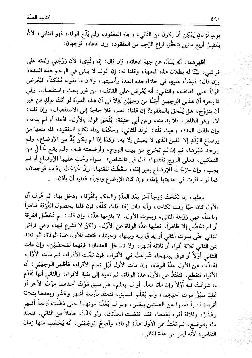 ومنْها، إذا نكَحَتْ زوجاً آخر بعْد العدَّةِ والحكم بالفُرْقة، ودخل بها، ثم عُرِف أن الأول كان حيًّا وقت نكاحه، وأنه مات بَعْد ذلك كلِّهَ، فإن قلنا بحصول الفُرْقة ظاهراً وباطناً، فهي زوْجة الثاني، وبموت الأول، لا يلزمها عدَّة، وإن قلنا: لم تَحْصُل الفرقة أو لم تحْصُل إلا ظاهراً، فعليها عدَّة الوفاة عن الأوَّل، ولكنْ لا تشرع فيها، وهي فراش للثاني حتَّى يموت الثاني أو يفرق بينه وبينها، وحينئذ، فتعتد للأول عدَّة الوفاة، ثم تعتد عن الثاني ثلاثة أقراء أو ثلاثة أشهر، ولا تتداخل العدتان؛ فإنهما لشخصَيْن، وإن مات الثاني أَوَّلًا أو فرق بينهما، شَرَعَتْ في الأقراء، فإن تمَّت الأقراء، ثم مات الأوَّل، اعْتدَّت عن الأول عدَّةَ الوفاة، وإن مات الأول قَبْل تمام الأقراء، فأظهر الوجهَيْنِ: أن الأقراء تنقطع، فتَعْتَدُّ عن الأول عدَّة الوفاة، ثم تعود إلى بقية الأقراء، والثاني أنها تُقَدِّم ما شرَعَتْ فيه أَوَّلاً وإن ماتا معاً، أو لم يعلم، هل سبق مَوْتُ أحدهما موْتَ الآخر أو عُلِمَ سبْقُ موتِ أحدِهِما، ولم يُعْلَم السابق، فتعتد بأربعة أشهر وعَشْرٍ وبعدها بثلاثة أقراء؛ لتبرأ ذمتها عن العدتين بيقين، ولو لم يُعْلَمْ موتهما حتى مَضَت أربعةُ أشهرٍ وعَشْرٌ، وثلاثة أقراء بَعْدها، فقد انقضت العدَّتان، ولو كانَتْ حاملاً من الثاني، فتعتد منْه بالوضع، ثم تعْتدُّ عن الأول عدَّة الوفاة، وأصحُّ الوجْهَيْن: أنه يُحْسَب منها زمان النفاس؛ لأنه ليس من عدَّة الثاني.