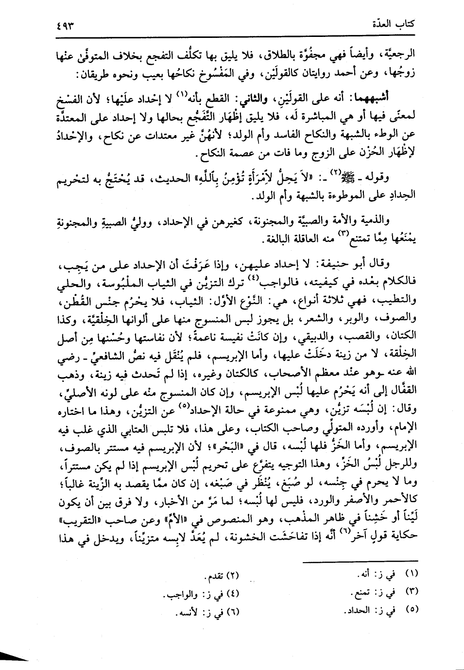 وقال أبو حنيفة: لا إحداد عليهن، وإذا عَرَفْتَ أن الإحداد على من يَجِب، فالكلام بعْده في كيفيته، فالواجب (¬4) ترك التزيُّن في الثياب الملُبُوسة، والحلي والتطيب، فهي ثلاثة أنواع، هي: النَّوْع الأوَّل: الثياب، فلا يحْرُم جنْس القُطْن، والصوف، والوبر، والشعر، بل يجوز لبس المنسوج منها على ألوانها الخِلْقيَّة، وكذا الكتان، والقصب، والدبيقي، وإن كانَتْ نفيسة ناعمةً؛ لأن نفاستها وحُسْنها مِن أصل الخِلْقة، لا من زينة دخَلَتْ عليها، وأما الإبريسم، فلم يُنْقَل فيه نصُّ الشافعيِّ -رضي الله عنه- هو عنْد معظم الأصحاب، كالكتان وغيره، إذا لم تَحدث فيه زينة، وذهب القفَّال إلى أنه يَحْرُم عليها لُبْس الإبريسم، وإن كان المنسوج منْه على لونه الأصليِّ، وقال: إن لُبْسَه تزيُّن، وهي ممنوعة في حالة الإحداد (¬5) عن التزيُّن، وهذا ما اختاره الإِمام، واورده المتولِّي وصاحب الكتاب، وعلى هذا، فلا تلبس العتابي الذي غلب فيه الإبريسم، وأما الخَزُّ فلها لُبْسه، قال في "البَحْر"؛ لأن الإبريسم فيه مستتر بالصوف، وللرجل لُبْسُ الخَزِّ، وهذا التوجيه يتفرَّع على تحريم لُبْس الإبريسم إذا لم يكن مستتراً، وما لا يحرم في جِنْسه، لو صُبَغ، يُنْظَر في صَبْغه، إن كان ممَّا يقصد به الزِّينة غالباً؛ كالأحمر والأصفر والورد، فليس لها لُبْسه؛ لما مَرَّ من الأخبار، ولا فرق بين أن يكون لَيِّناً أو خَشِناً في ظاهر المذْهب، وهو المنصوص في "الأمِّ" وعن صاحب "التقريب" حكايته قولٍ آخر (¬6) أنَّه إذا تفاحَشَت الخشونة، لم يُعَدَّ لابِسه متزيَّناً، ويدخل في هذا