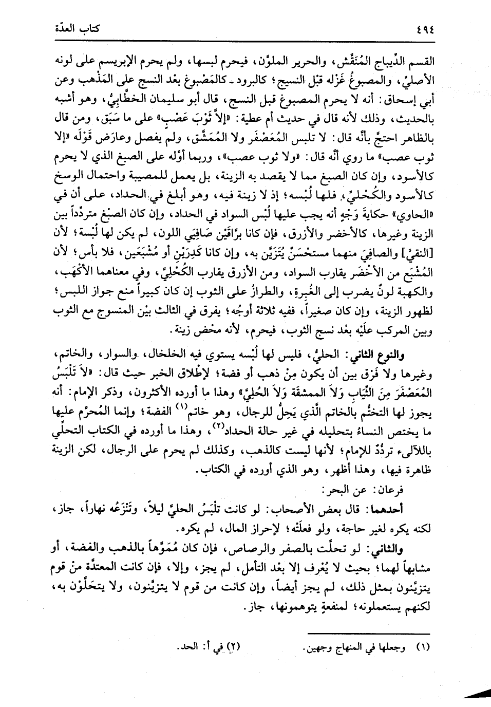 والنوع الثاني: الحليُّ، فليس لها لُبْسه يستوي فيه الخلخال، والسوار، والخاتم، وغيرها ولا فَرْق بين أن يكون مِنْ ذهب أو فضة؛ لإطْلاق الخبر حيث قال: "لاَ تَلْبَسُ المُعَصْفَرَ مِنَ الثِّيَاب وَلاَ الممشقَة وَلاَ الحُلِيَّ" وهذا ما أورده الأكثرون، وذكر الإِمام: أنه يجوز لها التختُّم بَالخاتم الَّذي يَحِلُّ للرجال، وهو خاتم (¬1) الفضة؟ وإنما المُحرَّم عليها ما يختص النساءُ بتحليله في غير حالة الحداد (¬2)، وهذا ما أورده في الكتاب التحلِّي باللآلئ تردُّدٌ للإمام؛ لأنها ليست كالذهب، وكذلك لم يحرم على الرجال، لكن الزينة ظاهرة فيها، وهذا أظهر، وهو الذي أورده في الكتاب.
