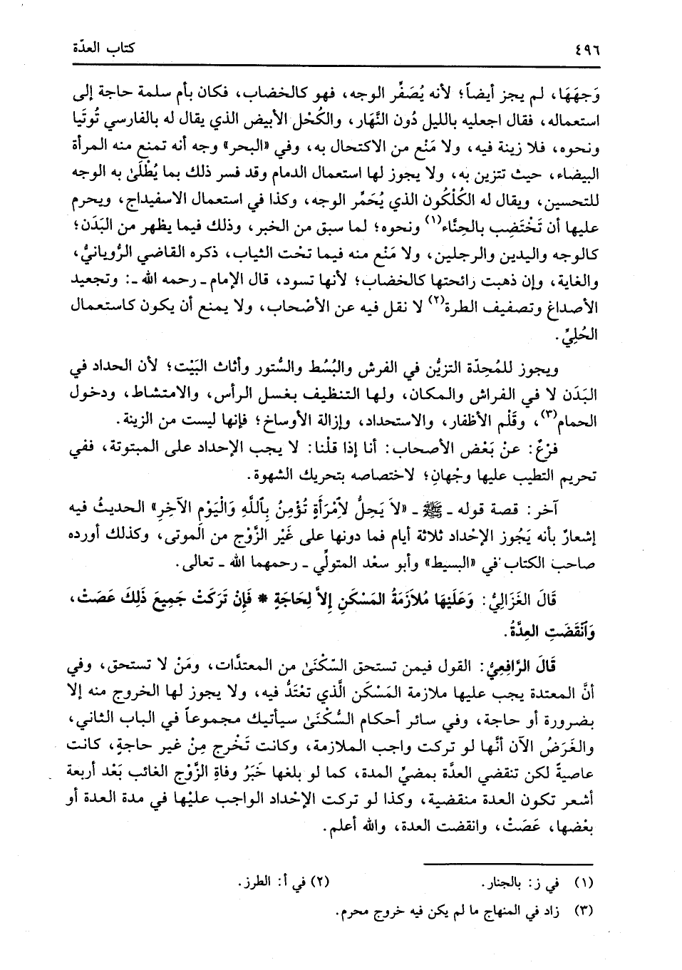 قَالَ الرَّافِعِيُّ: القول فيمن تستحق السّكْنَى من المعتدَّات، ومَنْ لا تستحق، وفي أنَّ المعتدة يجب عليها ملازمة المَسْكَن الَّذي تعْتَدُّ فيه، ولا يجوز لها الخروج منه إلا بضرورة أو حاجة، وفي سائر أحكام السُّكْنَى سيأتيك مجموعاً في الباب الثاني، والغَرَضُ الآن أنَّها لو تركت واجب الملازمة، وكانت تَخْرج مِنْ غير حاجةٍ، كانت عاصيةً لكن تنقضي العدَّة بمضيَّ المدة، كما لو بلغها خَبَرُ وفاةِ الزَّوْج الغائب بَعْد أربعة أشعر تكون العدة منقضية، وكذا لو تركت الإحْداد الواجب عليْها في مدة العدة أو بعْضها، عَصَتْ، وانقضت العدة، والله أعلم.
