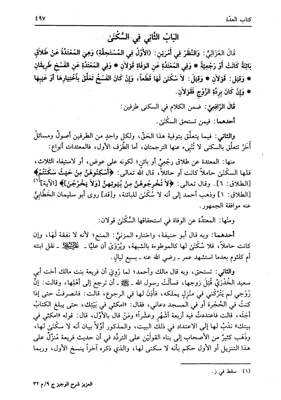 قَالَ الغَزَالِيُّ: وَالنَّظَرُ في أَمْرَيْنِ: (الأَوَّلُ في المُسْتَحِقَّةِ) وَهِيَ المُعْتَدَّةُ عَنْ طَلاَقٍ بَائِنَةً كَانَتْ أَوْ رَجْعِيَّةً* وَفِي المُعْتَدَّةِ عَنِ الوَفَاةِ قَوْلاَنِ* وَفِي المُعْتَدَّةِ عَنِ الفَسْخِ طَرِيقَانِ* وَقِيل: قَوْلاَنِ * وَقِيْلَ: لاَ سُكْنَى لَهَا قَطْعاً، وَإِنْ كَانَ الفَسْخ تَعَلَّقَ باختِيَارِهَا أوْ عَيْبِهَا* وَإِنْ كَانَ بِرِدَّةِ الزَّوْج فَقَوْلاَنِ.
