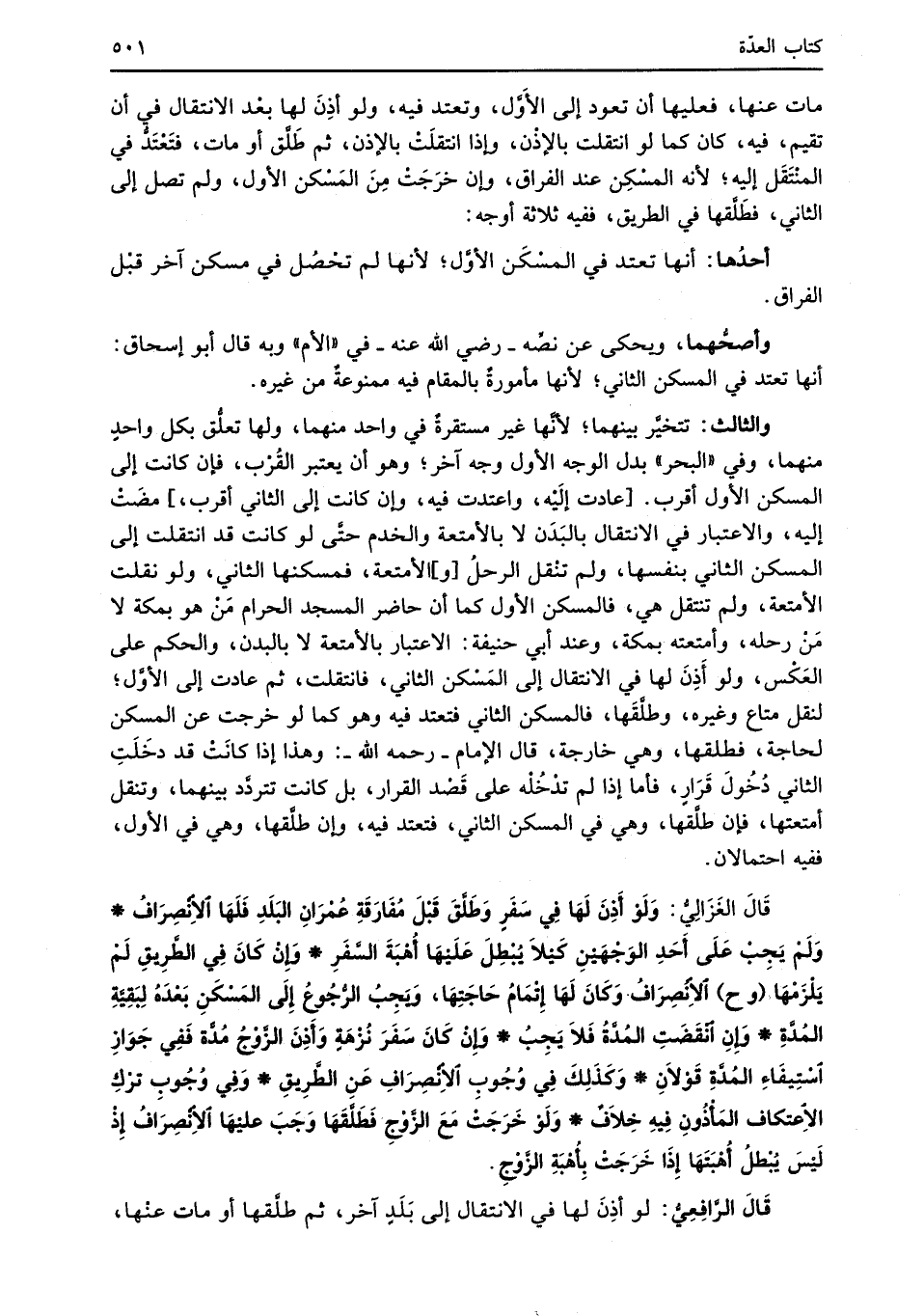 قَالَ الغَزَالِيُّ: وَلَوْ أَذِنَ لَهَا فِي سَفَرٍ وَطَلَّقَ قَبْلَ مُفَارَقَةِ عُمْرَانِ البَلَدِ فَلَهَا الانْصِرَافُ* وَلَمْ يَجِبْ عَلَى أَحَدِ الوَجْهَيْنِ كَيْلاَ يُبْطِلَ عَلَيْهَا أُهْبَةَ السَّفَرِ* وَإِنْ كَانَ في الطَّرِيقِ لَمْ يَلْزَمْهَا (وح) الانْصِرَافُ وَكَانَ لَهَا إِتْمَامُ حَاجَتِهَا، وَيجِبُ الرُّجُوعُ اِلَى المَسْكَنِ بَعْدَهُ لِبَقِيَّةِ المُدَّةِ* وَإِنِ انْقَضَتِ المُدَّةُ فَلاَ يَجِبُ* وَإِنْ كَانَ سَفَرَ نُزْهَةٍ وَأَذِنَ الزَّوْجُ مُدَّة فَفِي جَوَازِ اسْتِيفَاءِ المُدَّةِ قَوْلاَنِ* وَكَذَلِكَ في وُجُوبِ الاِنْصِرَافِ عَنِ الطَّرِيقِ* وَفِي وُجُوبِ ترْكِ الاِعتكاف المَأْذُونِ فِيهِ خِلاَفٌ* وَلَوْ خَرَجَتْ مَعَ الزَّوْجِ فَطَلَّقَهَا وَجَبَ عَليْهَا الاِنْصِرَافُ إِذْ لَيْسَ يُبْطلُ أهْبَتَهَا إِذَا خَرَجَتْ بِأُهْبَةِ الزَّوْجِ.