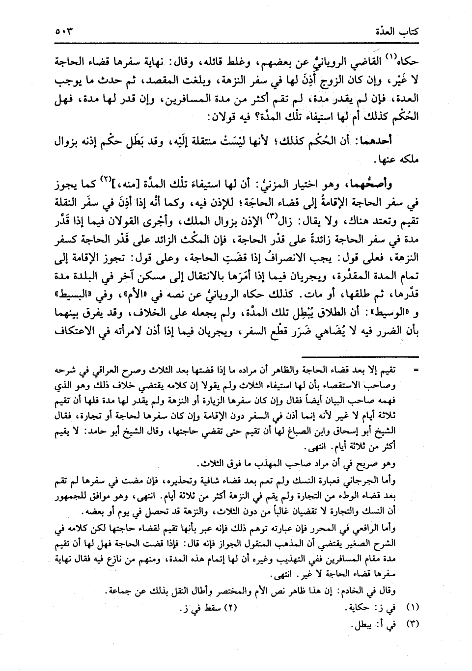 وأما الجرجاني فعبارة النسك ولم تعم بعد قضاء شافية وتحذيره، فإن مضت في سفرها لم تقم بعد قضاء الوطء من التجارة ولم يقم في النزهة أكثر من ثلاثة أيام. انتهى، وهو موافق للجمهور أن النسك والتجارة لا تقضيان غالباً من دون الثلاث، والنزهة قد تحصل في يوم أو بعضه.