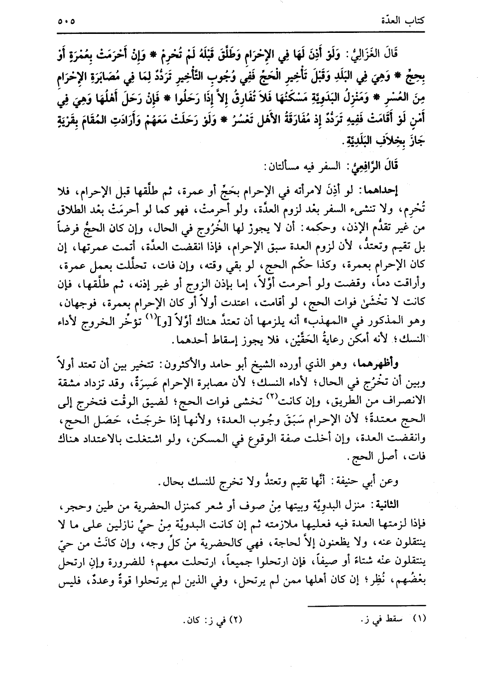 إحداهما: لو أذِنَ لامرأته في الإحرام بحَجِّ أو عمرة، ثم طلَّقها قبْل الإحرام، فلا تُحْرِم، ولا تنشئ السفر بعْد لزوم العدَّة، ولو أحرمتْ، فهو كما لو أحرمَتْ بعْد الطلاق من غير تقدُّم الإذن، وحكمه: أن لا يجوز لها الخُرُوج في الحال، وإن كان الحجُّ فرضاً بل تقيم وتعتدُّ؛ لأن لزوم العدة سبق الإحرام، فإذا انقضت العدَّة، أتمت عمرتها، إن كان الإحرام بعمرة، وكذا حكْم الحج، لو بقي وقته، وإن فات، تحلَّلت بعمل عمرة، وأراقت دماً، وقفت ولو أحرمت أوَّلاً، إما بإذن الزوج أو غير إذنه، ثم طلَّقها، فإن كانت لا تخْشَى فوات الحج، لو أقامت، اعتدت أولاً أو كان الإحرام بعمرة، فوجهان، وهو المذكور في "المهذب" أنه يلزمها أن تعتدَّ هناك أوَّلًا [و] (¬1) تؤخِّر الخروج لأداء النسك؛ لأنه أمكن رعايةُ الحَقَّيْن، فلا يجوز إسقاط أحدهما.