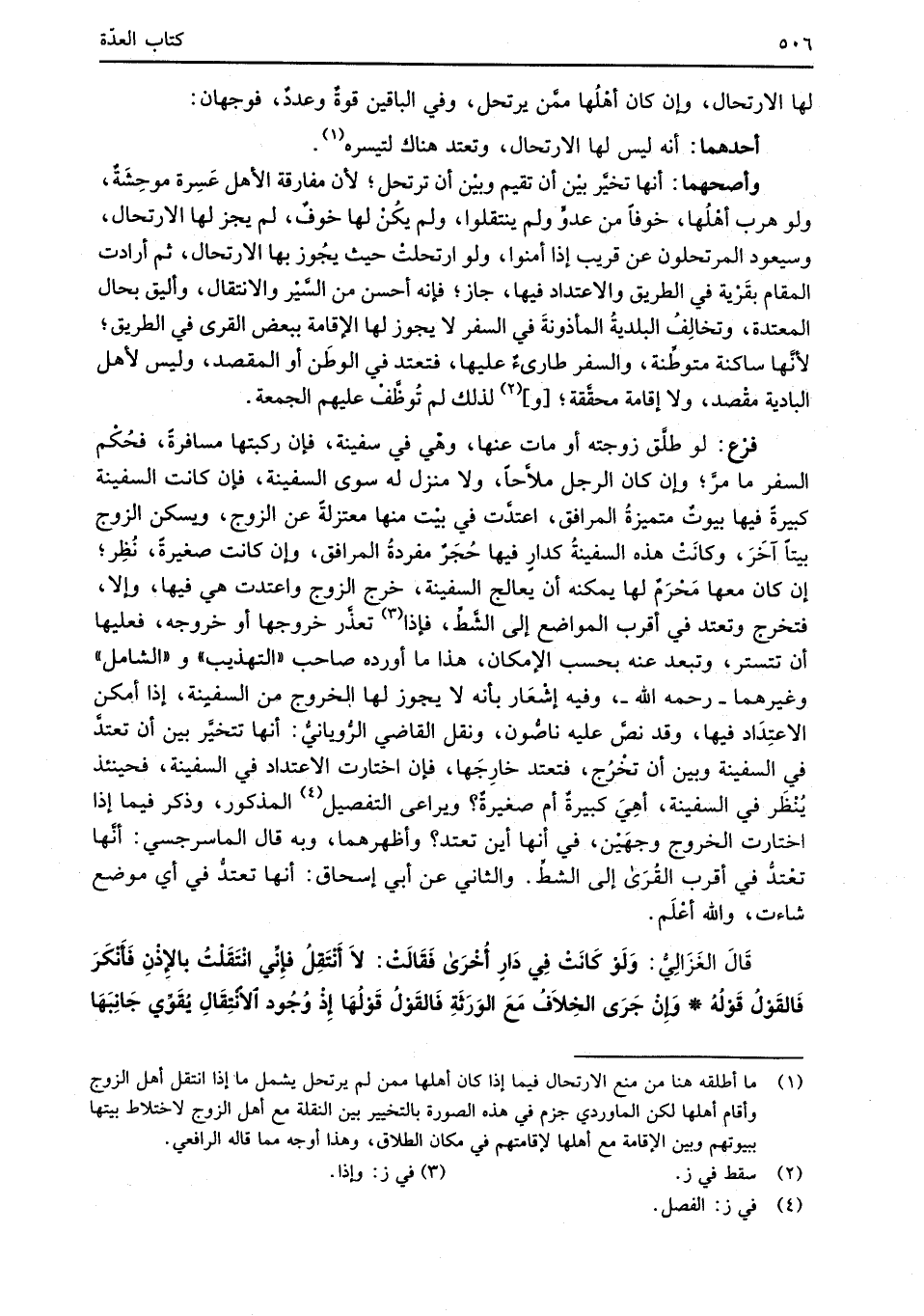 فرْع: لو طلَّق زوجته أو مات عنها، وهْي في سفينة، فإن ركبتها مسافرةً، فحُكْم السفر ما مرَّ؛ وإن كان الرجل ملًاحاً، ولا منزل له سوى السفينة، فإن كانت السفينة كبيرةً فيها بيوتٌ متميزةُ المرافق، اعتدَّت في بيْت منها معتزلةً عن الزوج، ويسكن الزوج بيتاً آخَرَ، وكانَتْ هذه السفينةُ كدارٍ فيها حُجَرٌ مفردةُ المرافق، وإن كانت صغيرةً، نُظِر؛ إن كان معها مَحْرَمٌ لها يمكنه أن يعالج السفينة، خرج الزوج واعتدت هي فيها، وإلا، فتخرج وتعتد في أقرب المواضع إلى الشَّطِّ، فإذا (¬3) تعذَّر خروجها أو خروجه، فعليها أن تتستر، وتبعد عنه بحسب الإمكان، هذا ما أورده صاحب "التهذيب" و"الشامل" وغيرهما -رحمه الله-، وفيه إشْعَار بأنه لا يجوز لها ابخروج من السفينة، إذا أمكن الاعتِدَاد فيها، وقد نصَّ عليه ناصُّون، ونقل القاضي الرُّويانيُّ: أنها تتخيَّر بين أن تعتدَّ في السفينة وبين أن تخْرُج، فتعتد خارِجَها، فإن اختارت الاعتداد في السفينة، فحينئذ يُنْظَر في السفينة، أهِيَ كبيرةٌ أم صغيرةٌ؟ ويراعى التفصيل (¬4) المذكور، وذكر فيما إذا اختارت الخروج وجهَيْن، في أنها أين تعتد؟ وأظهرهما، وبه قال الماسرجسي: أنَّها تعْتدُّ في اْقرب القُرَى إلى الشطِّ. والثاني عن أبي إسحاق: أنها تعتدُّ في أي موضع شاءت، والله أعْلَم.
