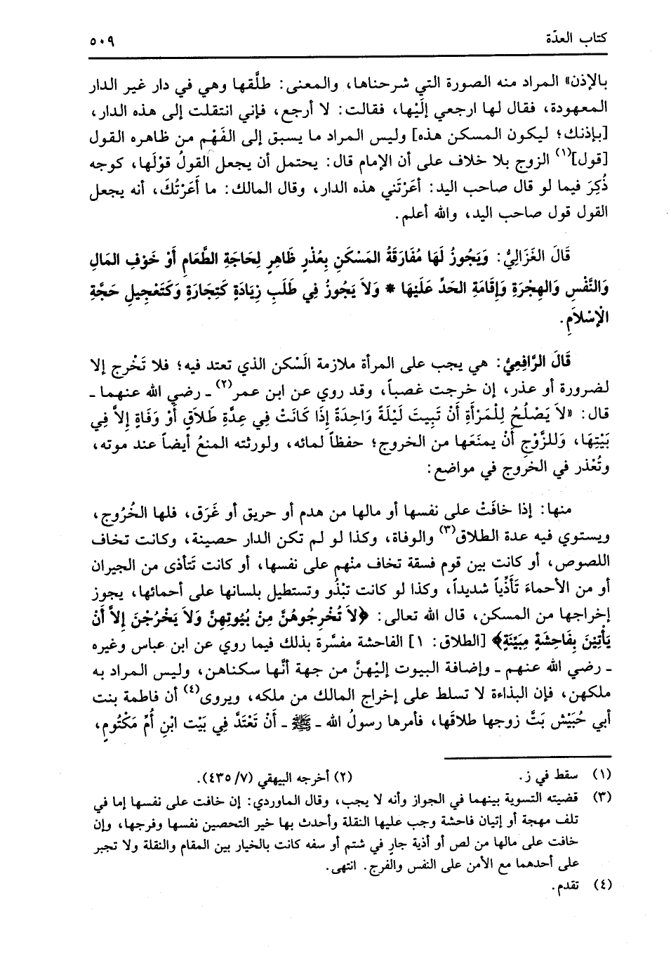 قَالَ الرَّافِعِيُّ: هي يجب على المرأة ملازمة السكن الذي تعتد فيه؛ فلا تَخْرج إلا لضرورة أو عذر، إن خرجت غصباً، وقد روي عن ابن عمر (¬2) -رضي الله عنهما- قال: "لاَ يَصْلْحُ لِلْمَرْأَةِ أنْ تَبِيتَ لَيْلَةً وَاحِدَةً إِذَا كَانَتْ فِي عِدَّةِ طَلاَقٍ أَوْ وَفَاةٍ إِلاَّ في بَيْتِهَا، وَللزَّوْج أنْ يمنَعَها من الخروج؛ حفظاً لمائه، ولورثته المنعُ أيضاً عند موته، وتُعْذر في الخروج في مواضع: