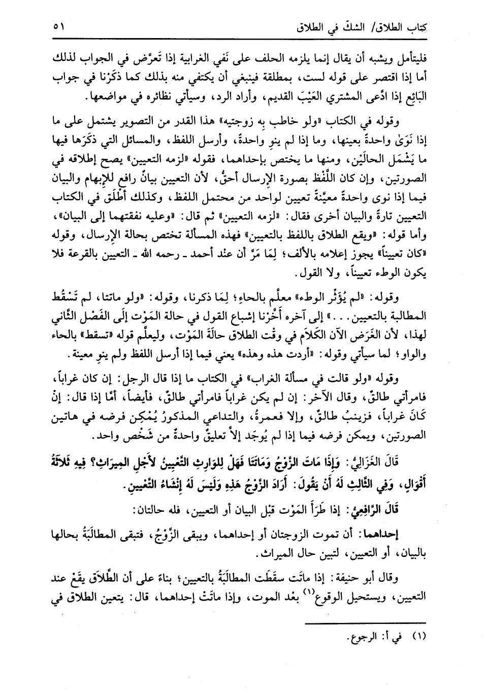 فليتأمل ويشبه أن يقال إنما يلزمه الحلف على نَفي الغرابية إذا تَعرَّض في الجواب لذلك أما إذا اقتصر على قوله لست، بمطلقة فينبغي أن يكتفي منه بذلك كما ذكَرْنا في جواب البَائِع إذا ادَّعى المشتري العَيْبَ القديم، وأراد الرد، وسيأتي نظائره في مواضعها.
