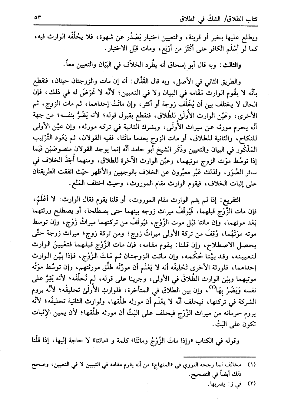 التفريع: إذا لم يقمِ الوارث مقام الموروث، أو قلنا يقوم فقال الوارث: لا أعْلَمُ، فإن مات الزَّوْج قبلهما، فيُوقَفُ ميراث زوجه بينهما حتى يصطلحا، أو يصطلح ورثتهما بَعْد موتهما، وإن ماتتا قبْل موت الزَّوْج، فيُوقَفُ من تركتهما ميراثُ زَوْج، وإن توسط موته موْتَهُما، وُقِفَ من تركة الأولى ميراثُ زوج؛ ومن تركة زوج؛ ميراث زوجة حتَّى يحصل الاصطلاح، وإن قلنا: يقوم مقامه، فإن مات الزَّوْج قبلهما فتعْيينُ الوارث لتعيينه، وقد بيَّنا حُكْمه، وإن ماتت الزوجتان ثم مَاتَ الزَّوْج، فإذا بيَّن الوارث إحداهما، فلورثة الأخرى تَحْلِيفُه أنه لا يَعْلَم أن مورِّثَه طلَّق مورثتهم، وإن توسَّط موْتُه موتيهما وبيّن الوارث الطَّلاقَ في الأولى، وجرينا على قوله، لم نُحلِّفْه؛ لأنه يُقِرُّ على نفسه وَيَضُرُّ بِهَا (¬2)، وإن بين الطلاق في المتأخرة، فلوارثِ الأُولَى تحليفُه؛ لأنَّه يروم الشركة في تركتها، فيحلف أنَّه لا يعْلَم أن مورثه طلَّقها, ولوارث الثانية تحليفُه؛ لأنَّه يروم حرمانه من ميراث الزَّوْج فيحلف على البَتِّ أن مورثه طلَّقها؛ لأن يمين الإِثبات تكون على البَتِّ.