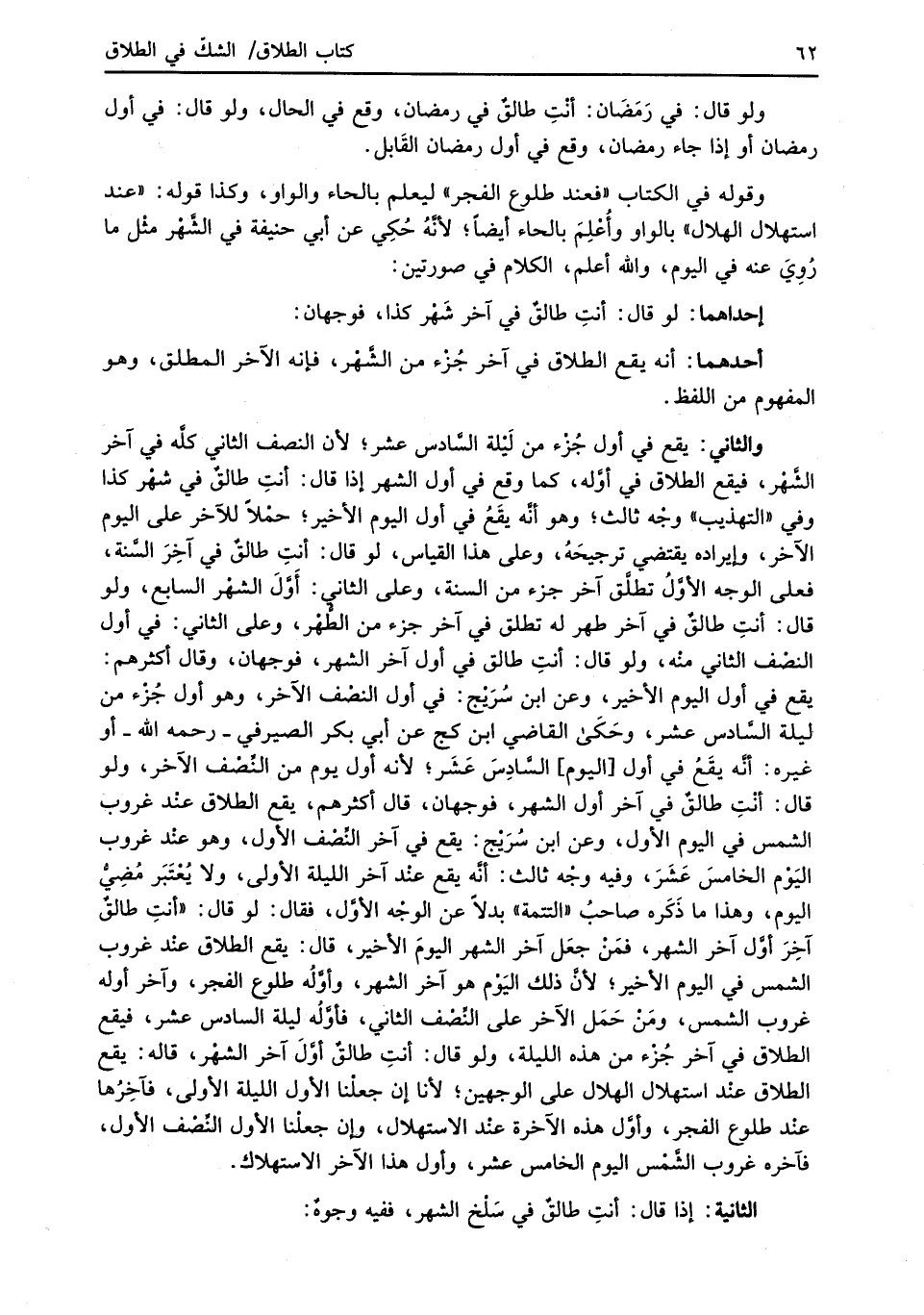 وقوله في الكتاب "فعند طلوع الفجر" ليعلم بالحاء والواو، وكذا قوله: "عند استهلال الهلال" بالواو وأُعْلِمَ بالحاء أيضاً؛ لأنَّهُ حُكِي عن أبي حنيفة في الشَّهْر مثْل ما رُوِيَ عنه في اليوم، والله أعلم، الكلام في صورتين: