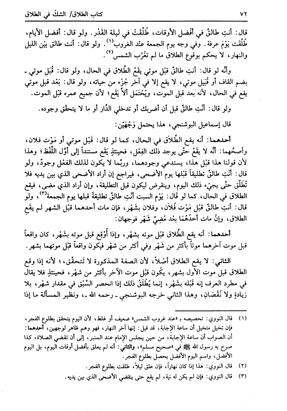 قال: أنتِ طالقٌ في أفْضل الأوقات، طُلِّقَتْ في ليلة القَدْر. ولو قال: أفضل الأيام، طُلِّقَت يَوْمَ عرفة. وفي وجه يوم الجمعة عنْد الغروب (¬1). ولو قال: أنت طالقٌ بيْن الليل والنهار، لا يحكم بوقوع الطلاق ما لم تغْرُب الشمس (¬2).