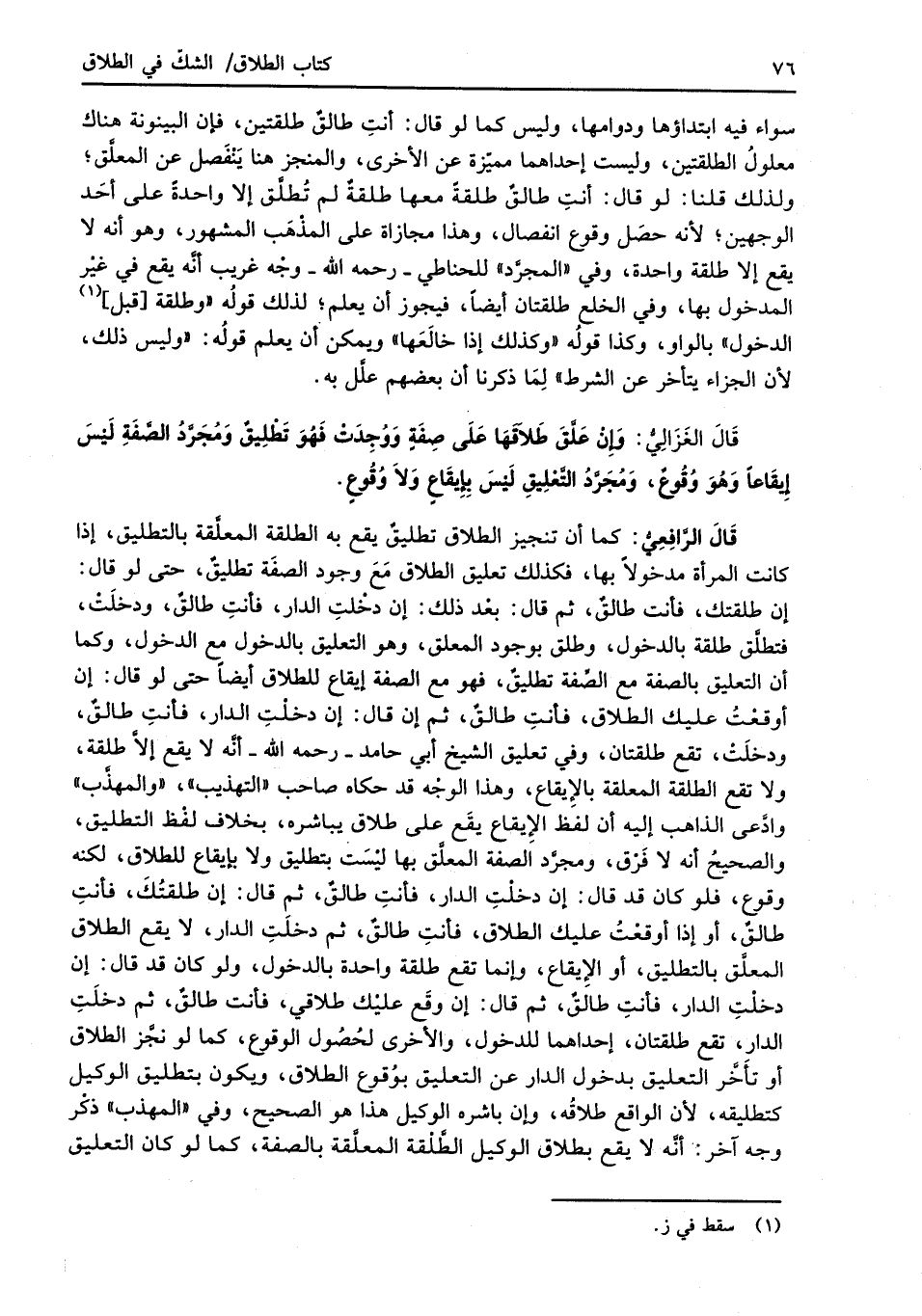 قَالَ الغَزَالِيُّ: وَإِنْ علَّقَ طَلاقَهَا علَى صِفَةٍ وَوُجِدَتْ فَهُوَ تَطْلِيقٌ وَمُجَرَّدُ الصِّفَةِ لَيْسَ إِيقَاعاً وَهُوَ وُقُوعٌ، وَمُجَرَّدُ التَّعْلِيقِ لَيْسَ بِإِيقَاعٍ وَلاَ وُقُوعٍ.