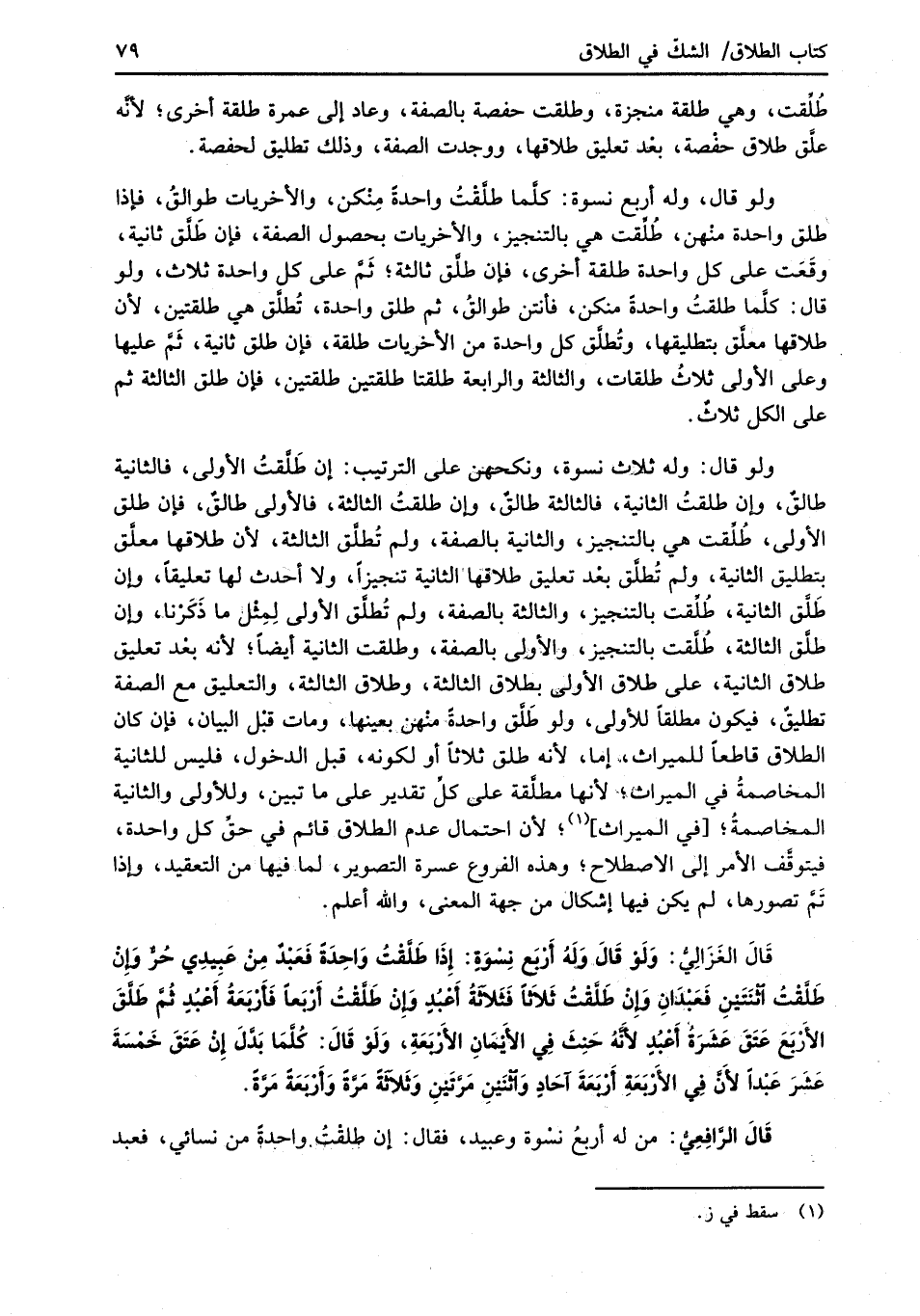 ولو قال: وله ثلاث نسوة، ونكحهن على الترتيب: إن طَلَّقتُ الأولى، فالثانية طالقٌ، وإن طلقتُ الثانية، فالثالثة طالقٌ، وإن طلقت الثالثة، فالأولى طالقٌ، فإن طلق الأولى، طُلِّقت هي بالتنجيز، والثانية بالصفة، ولم تُطلَّق الثالثة؛ لأن طلاقها معلَّق بتطليق الثانية، ولم تُطلَّق بعْد تعليق طلاقها الثانية تنجيزاً، ولا أحدث لها تعليقاً، وإن طَلَّق الثانية، طُلِّقت بالتنجيز، والثالثة بالصفة، ولم تُطلَّق الأولى لِمِثْل ما ذَكَرْنا، وإن طلَّق الثالثة، طُلِّقت بالتنجيز، والأولى بالصفة، وطلقت الثانية أيضاً؛ لأنه بعْد تعليق طلاق الثانية، على طلاق الأولى بطلاق الثالثة، وطلاق الثالثة، والتعليق مع الصفة تطليقٌ، فيكون مطلقاً للأولى، ولو طَلَّق واحدةً منْهن بعينها، ومات قبْل البيان، فإن كان الطلاق قاطعاً للميراث، إما, لأنه طلق ثلاثاً أو لكونه، قبل الدخول، فليس للثانية المخاصمةُ في الميراث؛ لأنها مطلَّقة على كلِّ تقدير على ما تبين، وللأولى والثانية المخاصمةُ؛ [في الميراث] (¬1)؛ لأن احتمال عدم الطلاق قائم في حقِّ كل واحدة، فيتوقَّف الأمر إلى الاصطلاح؛ وهذه الفروع عسرة التصوير، لما فيها من التعقيد، وإذا تَمَّ تصورها, لم يكن فيها إشكال من جهة المعنى، والله أعلم.