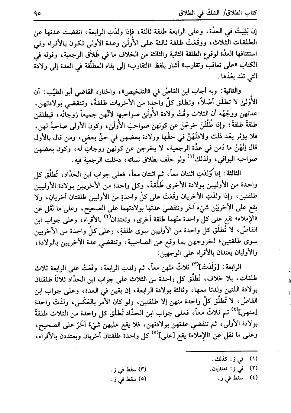 الثالثة: إذا وَلدَتِ اثنتان معاً، ثم اثنتان معاً، فعلى جواب ابن الحدَّاد، تُطلَّق كل واحدة من الأوليين بولادة الأخرى طَلْقةً، وكل واحدة من الأخريين بولادة الأوليين طلقتين، وإذا ولدَتِ الأخريان وقَعَتْ على كلِّ واحدةٍ من الأوليين طلقتان أخريانِ، ولا يقع على الأخريَيْن شيْء آخر وتنقضي عدتها بولادتهما على الصحيح، وعلى ما نَقَل عن "الإِملاء" تقع على كل واحدة منْهما طلقة أخرى، وتعتدان (¬2) بالأقراء، وعلى جواب ابن القاصِّ، لا تُطلَّق كل واحدة من الأوليين سوى طلقةٍ، وعلى كلِّ واحدة من الأخريين سوى طلقتين؛ لخروجهن بما وقع عن الصاحبية، وتنقضي عدة الأخريين بالولادة، والأوليان يعتدان بالأقراء على الوجهين:
