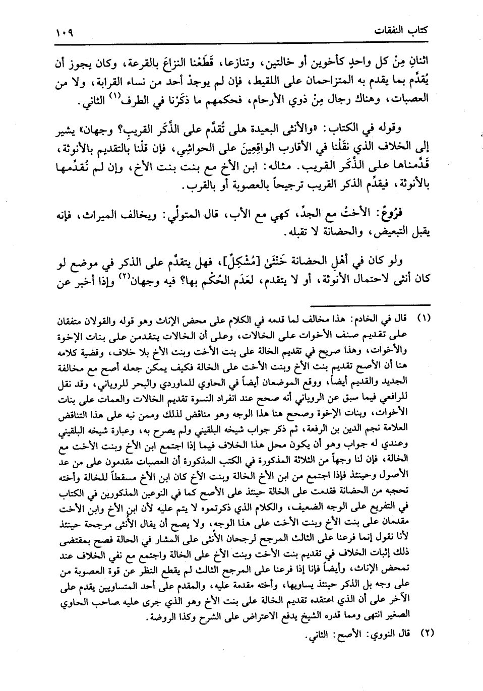 وقوله في الكتاب: "والأنثى البعيدة هلى تُقدَّم على الذَّكَر القريبِ؟ وجهان" يشير إلى الخلاف الذي نقَلْنا في الأقارب الواقِعِينَ على الحواشِي، فإن قلْنا بالتقديم بالأنوثة، قَدَّمناها على الذَّكَر القريب. مثاله: ابن الأخ مع بنت بنت الأخ، وإن لم نُقدِّمها بالأنوثة، فيقدِّم الذكر القريب ترجيحاً بالعصوبة أو بالقرب.