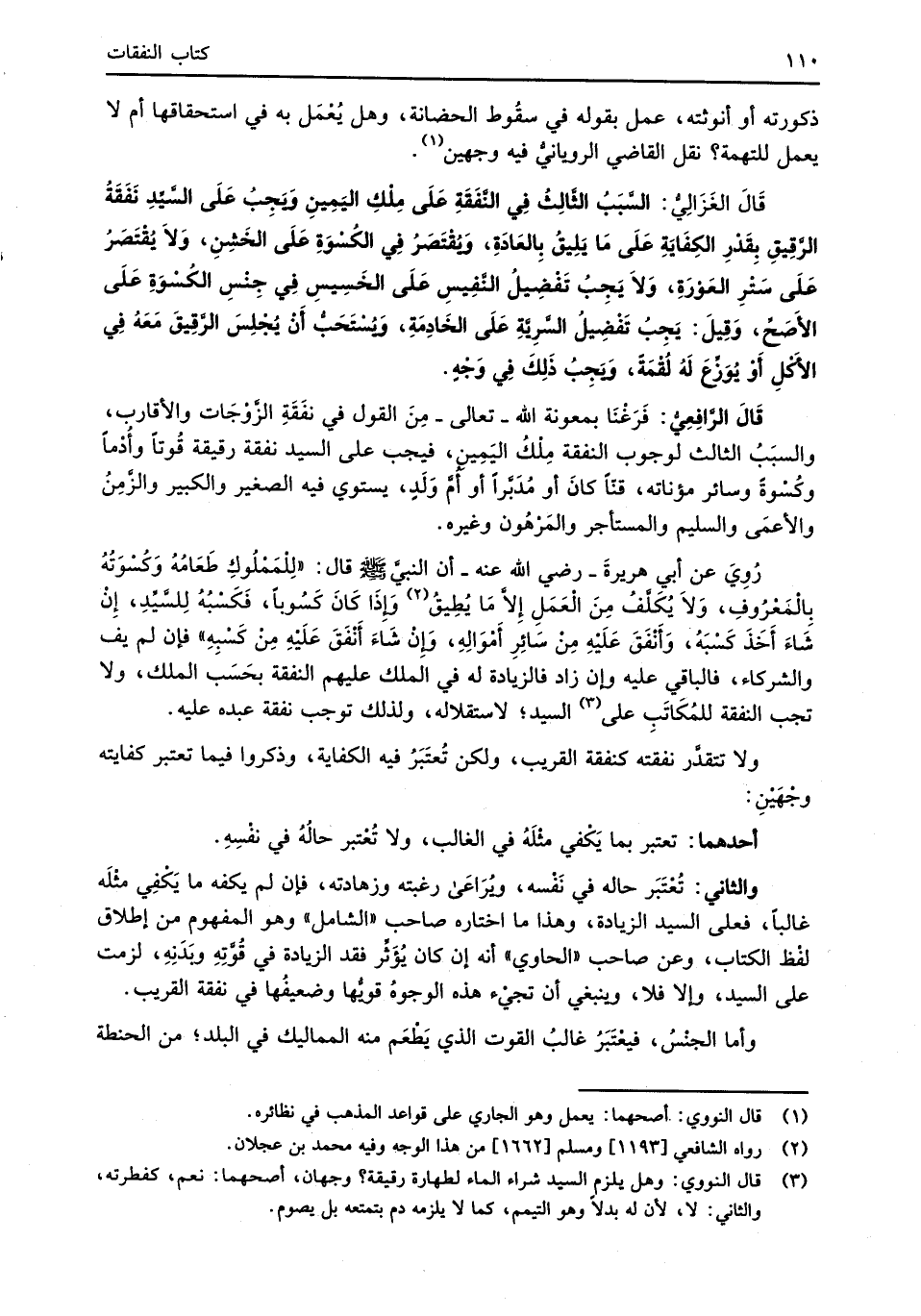قَالَ الغَزَالِيُّ: السَّبَبُ الثَّالِثُ فِي النَّفَقَةِ عَلَى مِلْكِ اليَمِينِ وَيَجِبُ عَلَى السَّيِّدِ نَفَقَةُ الرَّقِيقِ بِقَدْرِ الكِفَايَةِ عَلَى مَا يَلِيقُ بِالعَادَةِ، وَيُقْتَصَرُ فِي الكُسْوَةِ عَلَى الخَشِنِ، وَلاَ يُقْتَصَرُ عَلَى سَتْرِ العَوْرَةِ، وَلاَ يَجِبُ تَفْضِيلُ النَّفِيسِ عَلَى الخَسِيسِ فِي جِنْسِ الكُسْوَةِ عَلَى الأَصَحِّ، وَقِيلَ: يَجِبُ تَفْضِيلُ السَّريَّةِ عَلَى الخَادِمَةِ، وَيُسْتَحَبُّ أَنْ يُجْلِسَ الرَّقِيقَ مَعَهُ فِي الأَكْلِ أَوْ يُوَزِّعَ لَهُ لُقْمَةً، وَيَجِبُ ذَلِكَ فِي وَجْهٍ.