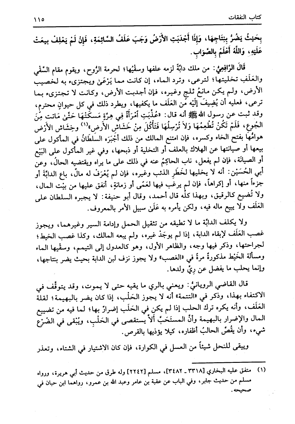 قال القاضي الرويانيُّ: ويعني بالري ما يقيه حتى لا يموت، وقد يتوقَّف في الاكتفاء بهذا، وذكر في "التتمة" أنه لا يجوز الحَلْب، إذا كان يضر بالبهيمة؛ لقلة العَلَف، وأنه يكره ترك الحلب إذا لم يكنِ في الحَلَب إضرارٌ بها؛ لما فيه من تضييع المال والإضرار بالبهيمة وأنَّ المستَحَبَّ ألاَّ يستقصى في الحَلْبِ، ويُبْقى في الضّرْع شيء، وأن يقُصَّ الحالبُ أظفاره، كيلا يؤذيها بالقرص.