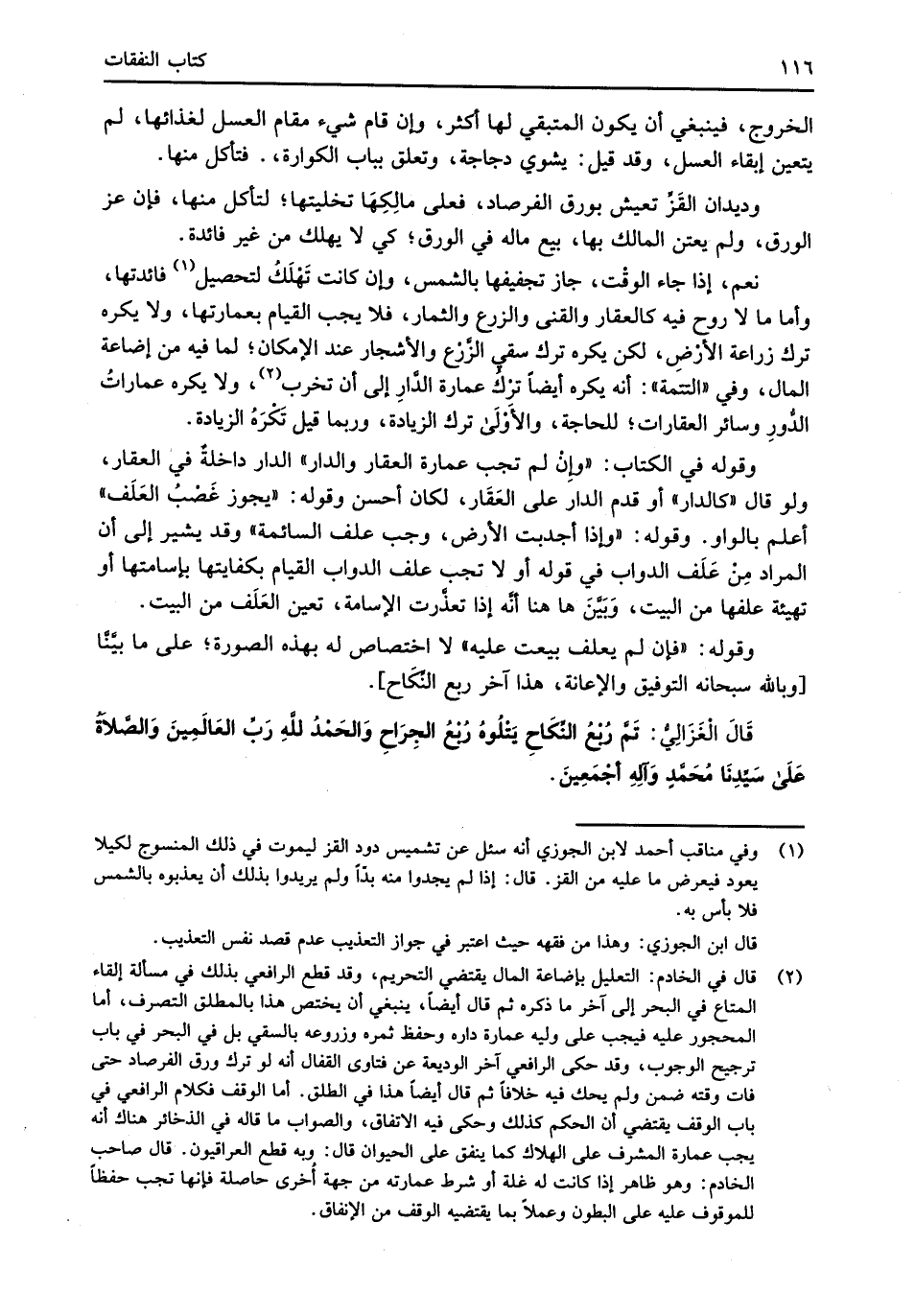 (¬2) قال في الخادم: التعليل بإضاعة المال يقتضي التحريم، وقد قطع الرافعي بذلك في مسألة إلقاء المتاع في البحر إلى آخر ما ذكره ثم قال أيضاً، ينبغي أن يختص هذا بالمطلق التصرف، أما المحجور عليه فيجب على وليه عمارة داره وحفظ ثمره وزروعه بالسقي بل في البحر في باب ترجيح الوجوب، وقد حكى الرافعي آخر الوديعة عن فتاوى القفال أنه لو ترك ورق الفرصاد حتى فات وقته ضمن ولم يحك فيه خلافاً ثم قال أيضاً هذا في الطلق. أما الوقف فكلام الرافعي في باب الوقف يقتضي أن الحكم كذلك وحكى فيه الاتفاق، والصواب ما قاله في الذخائر هناك أنه يجب عمارة المشرف على الهلاك كما ينفق على الحيوان قال: وبه قطع العراقيون. قال صاحب الخادم: وهو ظاهر إذا كانت له غلة أو شرط عمارته من جهة أُخرى حاصلة فإنها تجب حفظاً للموقوف عليه على البطون وعملاً بما يقتضيه الوقف من الإنفاق.