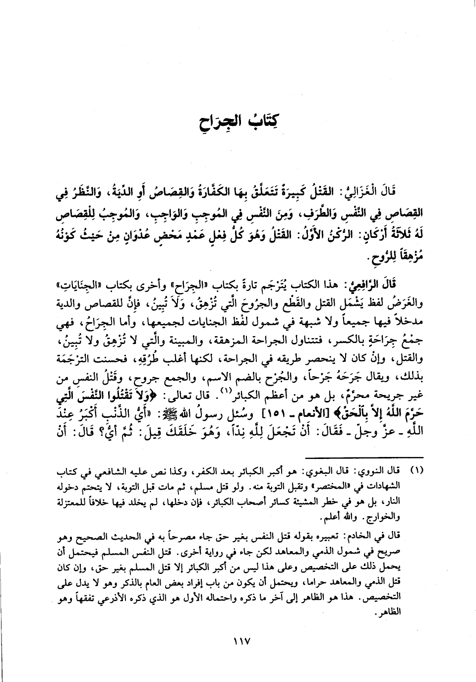 قَالَ الرَّافِعِيَّ: هذا الكتاب يُتَرْجَم تارةً بكتاب "الجِرَاح" وأخرى بكتاب "الجِنَايَاتِ" والغَرَضُ لفظ يَشْمَل القتل والقَطْع والجرُوحَ الَّتي تُزْهِقُ، وَلَاَ تُبِينُ، فإِنَّ للقصاص والدية مدخلاً فيها جميعاً ولا شبهة في شمول لفْظ الجنايات لجميعها، وأما الجِرَاحُ، فهي جمْعُ جِرَاحَةٍ بالكسر، فتتناول الجراحة المزهقة، والمبينة والتي لا تُزْهِقُ ولا تُبِينُ، والقتل، وإنْ كان لا ينحصر طريقه في الجراحة، لكنها أغلب طُرُقِهِ، فحسنت الترْجَمَة بذلك، ويقال جَرَحَهُ جَرْحاً، والجُرْح بالضم الاسم، والجمع جروح، وقَتْلُ النفسِ من غير جريحة محرَّمٌ، بل هو من أعظم الكبائر (¬1). قال تعالى: {وَلَا تَقْتُلُوا النَّفْسَ الَّتِي حَرَّمَ اللَّهُ إِلاَّ بِالْحَقِّ} [الأنعام: 151] وسُئل رسولُ الله -صلى الله عليه وسلم-: "أَيُّ الذَّنْب أَكْبَرُ عِنْدَ اللهِ -عزَّ وجلّ- فَقَالَ: أَنْ تَجْعَلَ لله نِدّاً، وَهُوَ خَلَقَكَ قِيلَ: ثُمَّ أيُّ؟ قَالَ: أَنْ