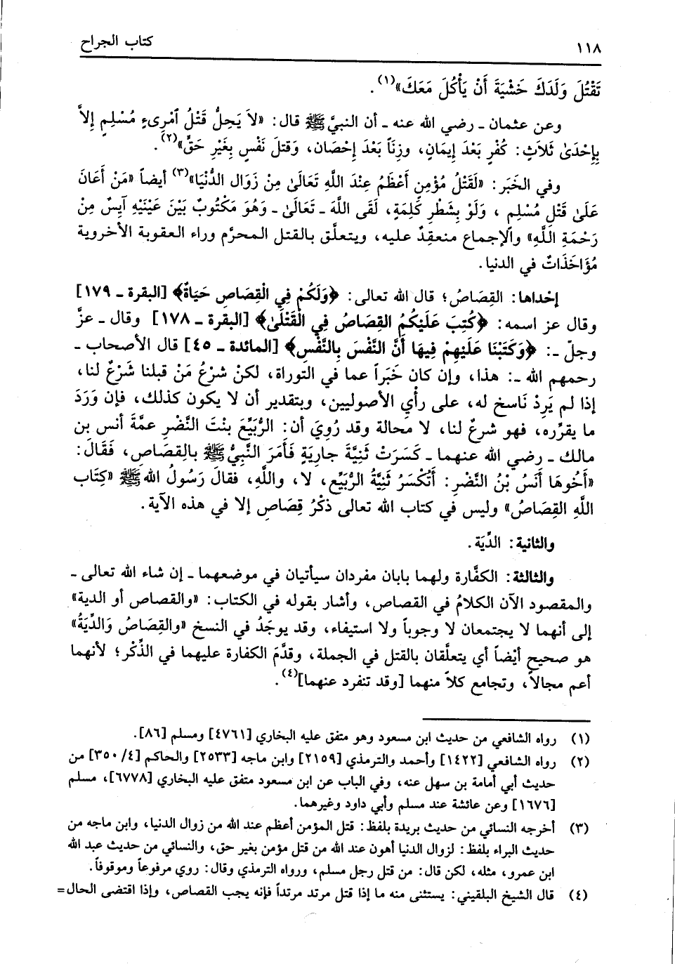 وعن عثمان -رضي الله عنه- أن النبيَّ -صلى الله عليه وسلم- قال:"لاَ يَحِلُّ قَتْلُ امْرِئٍ مُسْلِمٍ إِلاَّ بِإِحْدَى ثَلاَثٍ: كُفْرٍ بَعْدَ إِيمَانٍ، وزِنَاً بَعْدَ إِحْصَان، وَقتلَ نفْسٍ بِغَيْرِ حَقٍّ" (¬2).