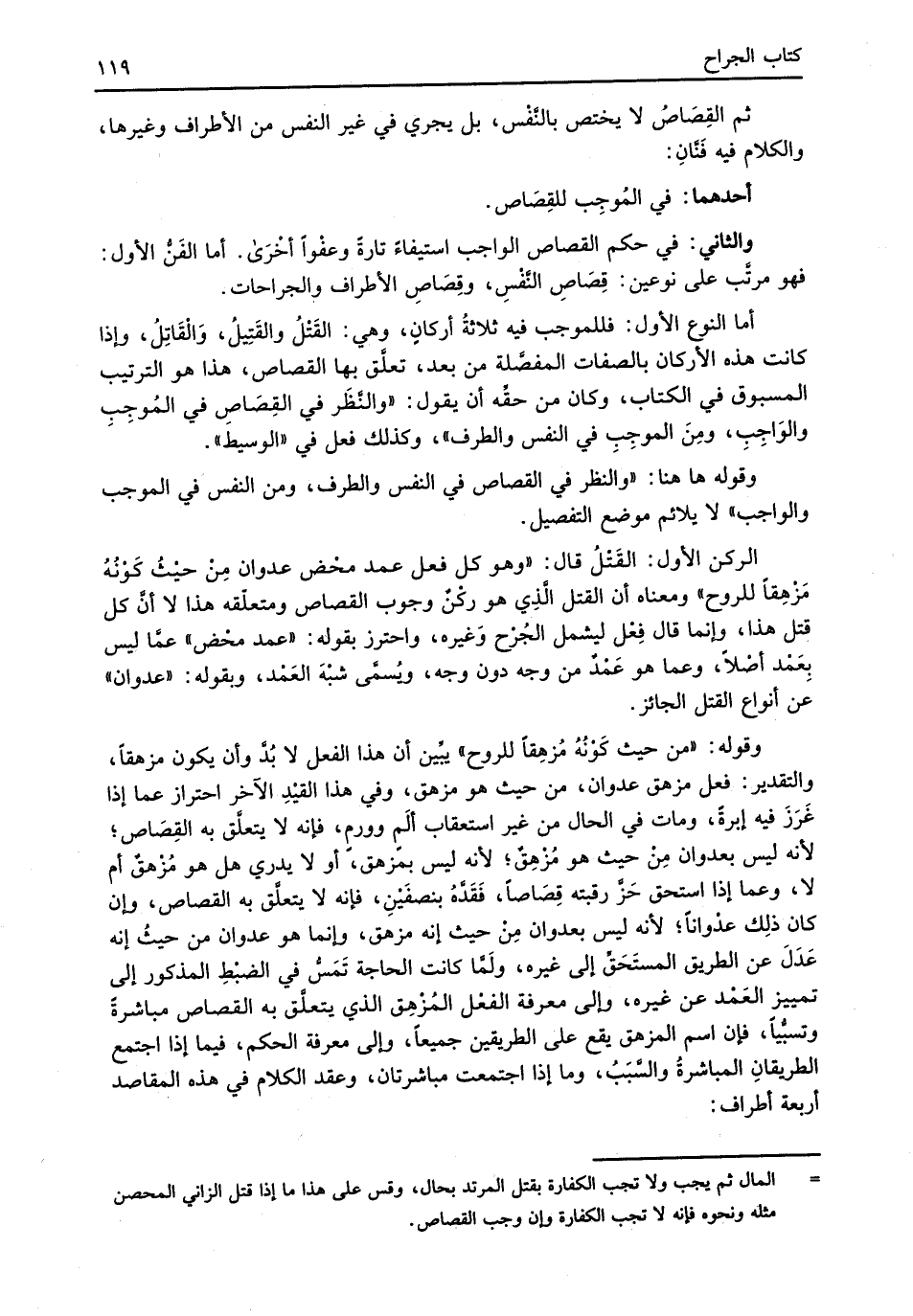 والثاني: في حكم القصاص الواجب استيفاءً تارةً وعفْواً أخْرَى. أما الفَنُّ الأول: فهو مرتَّب على نوعين: قِصَاصِ النَّفْسِ، وقِصَاصِ الأطراف والجراحات.