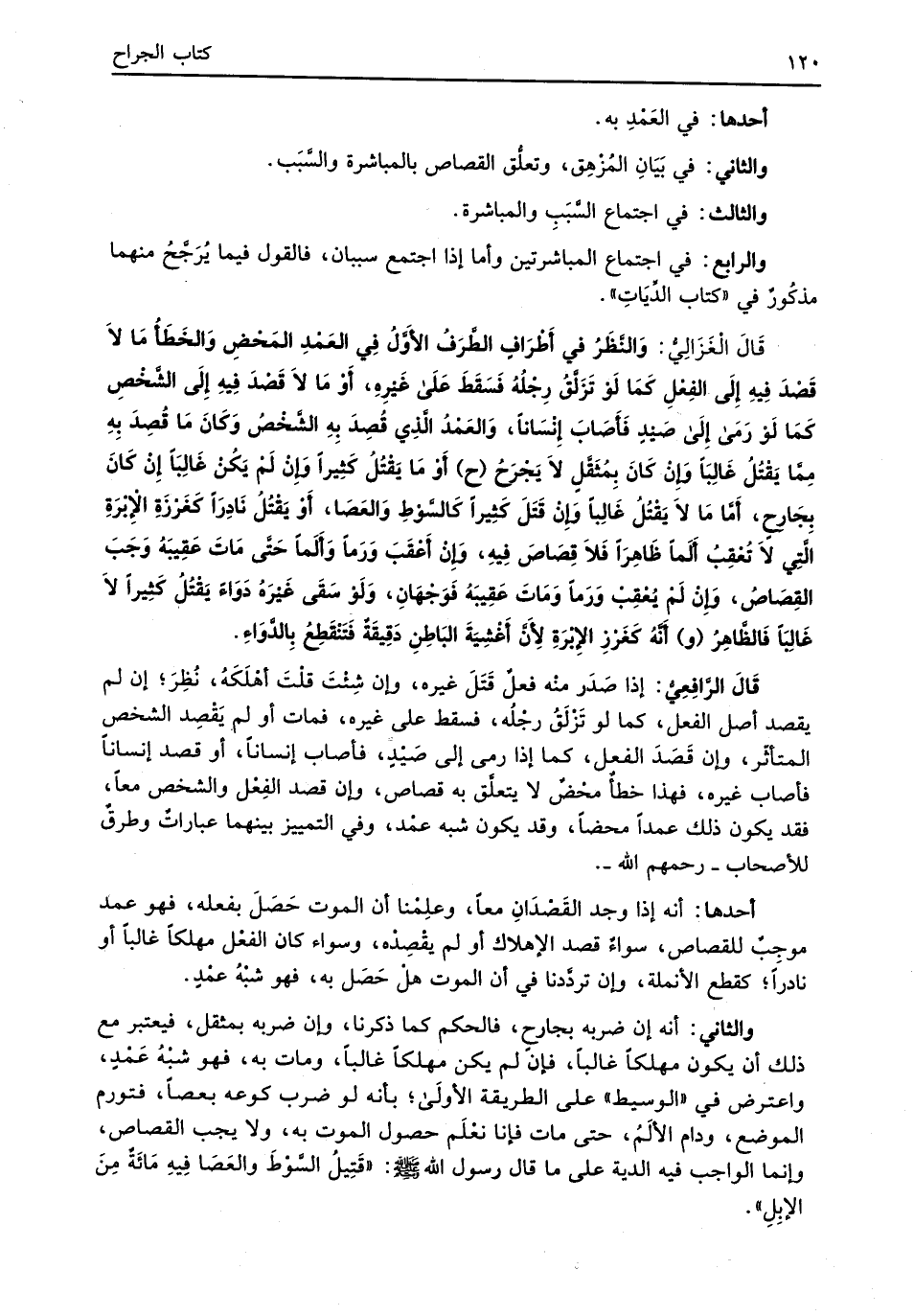 قَالَ الْغَزَالِيُّ: وَالنَّظَرُ في أَطْرَافٍ الطَّرَفُ الأَوَّلُ فِي العَمْدِ المَحْضِ وَالخَطَأُ مَا لاَ قَصْدَ فِيهِ إِلَى الفِعْلِ كَمَا لَوْ تَزَلَّق رِجلُهُ فَسَقَطَ عَلَى غَيْرِهِ، أَوْ مَا لاَ قصْدَ فِيهِ إِلَى الشَّخْصِ كَمَا لَوْ رَمَى إلى صَيْدٍ فَأصَابَ إِنْسَاناً، وَالعَمْدُ الَّذِي قُصِدَ بِهِ الشَّخْصُ وَكَانَ مَا قُصِدَ بِهِ مِمَّا يَقْتُلُ غَالِباً وإنْ كَانَ بِمُثَقَّلٍ لاَ يَجْرَحُ (ح) أَوْ مَا يَقْتُلُ كثِيراً وإنْ لَمْ يَكُنْ غَالِبَاً إنْ كَانَ بِجَارحٍ، أمَّا مَا لاَ يَقْتُلُ غالِباً وَإِنْ قَتَلَ كَثِيراً كَالسَّوْطِ وَالعَصَا، أَوْ يقْتُلُ نَادِرَاً كَغرْزَةِ الإِبْرَةِ الَّتِي لاَ تُعْقبُ أَلَمًا ظَاهِرَاً فلاَ قِصَاصَ فِيهِ، وَإِنْ أعْقَبَ وَرَماً وَأَلَماً حَتَّى مَاتَ عَقِيبَهُ وَجَبَ القِصَاصُ، وإنْ لَمْ يُعْقب وَرَماً وَمَاتَ عَقِيبَهُ فوَجْهَانِ، وَلَوْ سَقَى غَيْرَهُ دَوَاءً يَقْتُل كَثِيراً لاَ غَالِبَاً فَالظَّاهِرُ (و) أنَّهُ كَغَرْزِ الإبْرَةِ لِأَنَّ أَغْشِيَةَ البَاطِنِ دَقِيقَةٌ فَتَنْقَطِعُ بِالدَّوَاءِ.